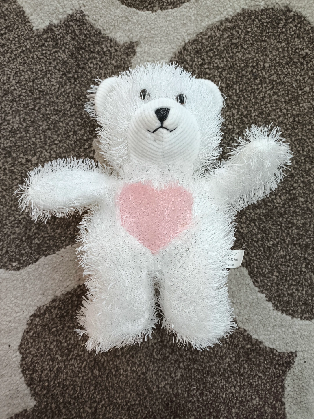 10A cute and cuddly white teddy bear featuring a sweet pink heart on its chest! Perfect for adding a touch of love to any room or as a comforting friend for someone special