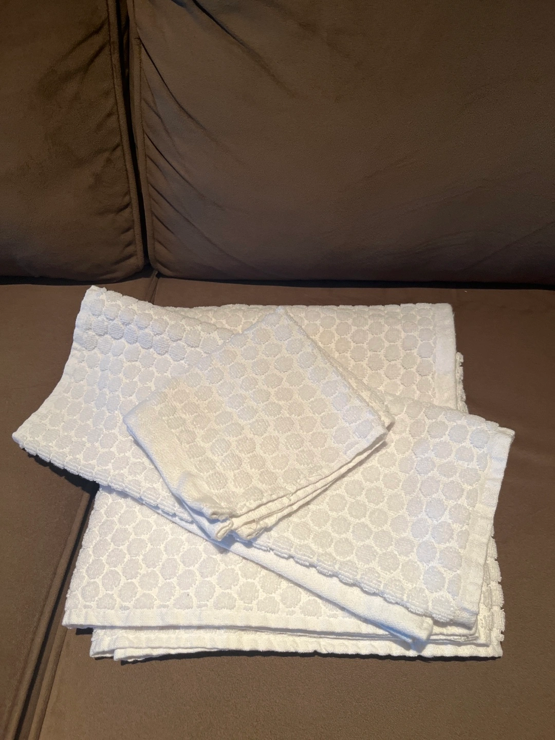 White towel set with a raised dot pattern 20 bath towels 10 hand towels 10 face towels Selling as lot Clearing my Airbnb Cash only Delivery not available