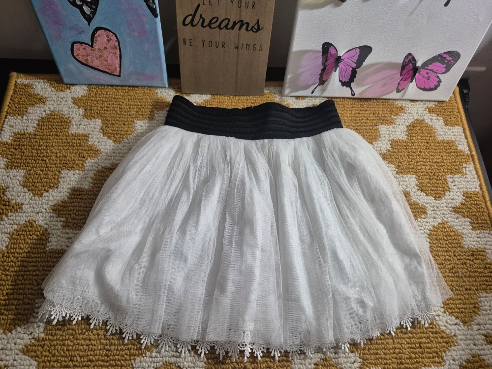 A white skirt. Features a black waistband. Delicate tulle material. A lovely piece to wear during a relaxing evening out.