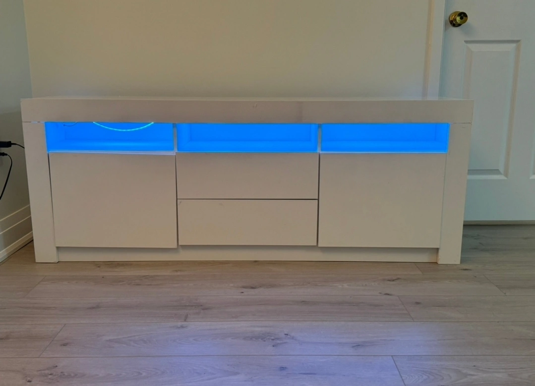 143Selling a white TV stand or media console. It features a sleek design with a modern touch, thanks to the built-in blue LED lighting. Perfect for adding a bit of ambiance to your living room while providing ample storage space. warehouse sale