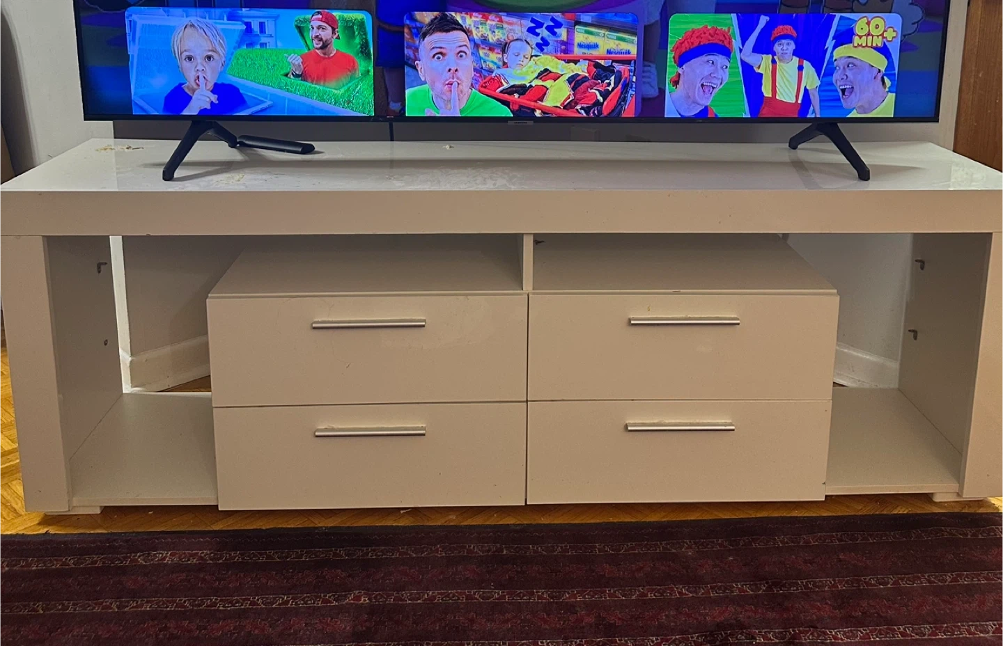 0Selling a white TV stand with drawers. It's in good condition and provides ample storage space. Perfect for organizing your entertainment area!