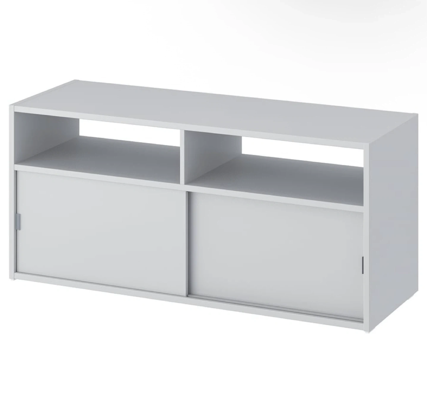 60This is a simple white TV stand with two open shelves and two sliding doors. It's perfect for a small space and provides ample storage for your media devices and accessories. The sliding doors make it easy to access your items while keeping them out of sight. Great condition!