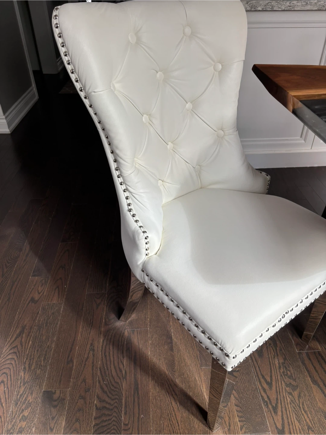 Selling a stylish white upholstered dining chair. It's in great condition and would look lovely in any dining room or as an accent chair. The chair features a tufted back and silver nailhead trim, adding a touch of elegance to its design Set of 2 Price is per chair