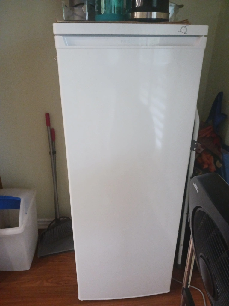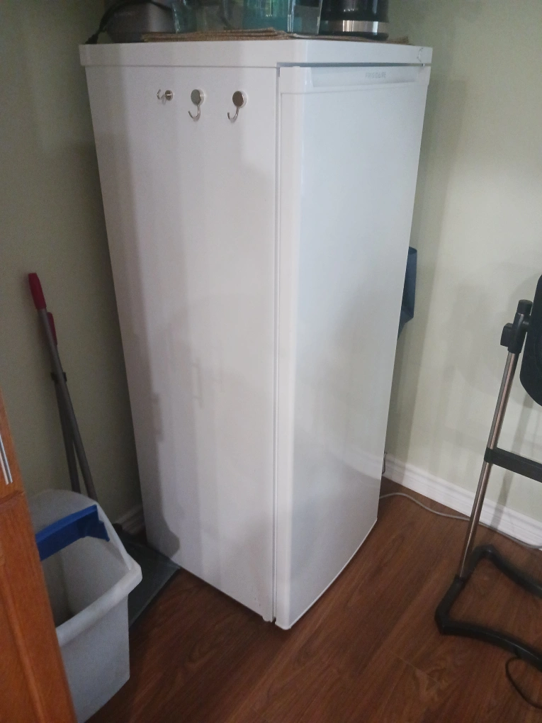 White upright freezer. Appears to be tall and narrow. Perfect for keeping all your favourite frozen snacks fresh, or storing your meal prep.