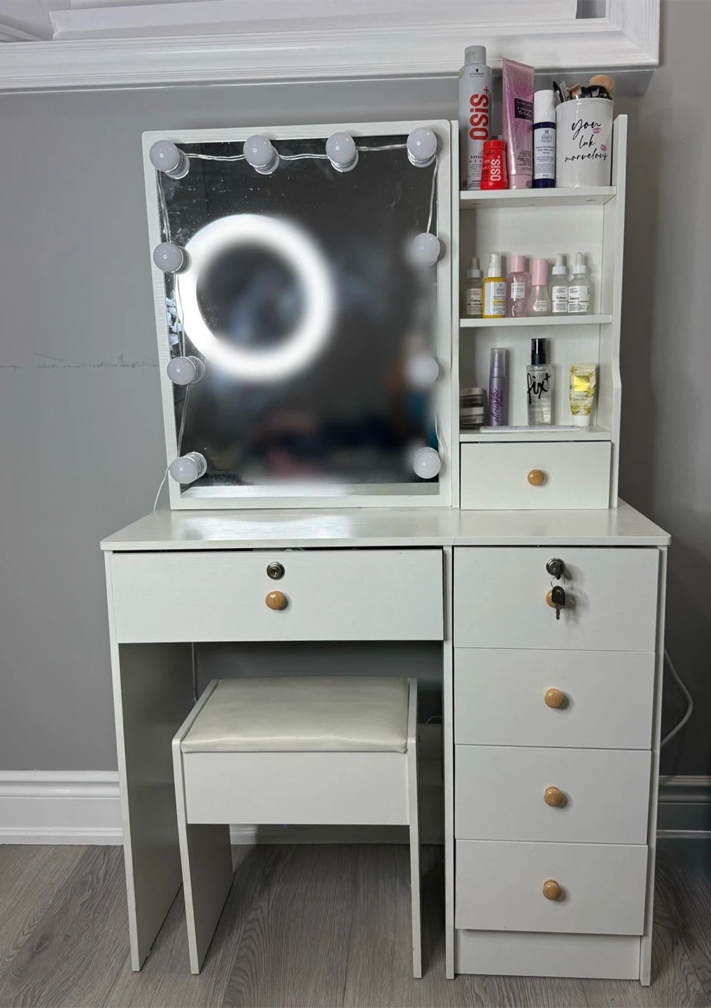 10Looking to sell this vanity makeup desk! It's in great condition and comes with a lighted mirror and a small stool. Perfect for getting ready in the morning or doing your makeup for a night out. It features a shelf and drawers for storage. I can give one queen size bed frame along with mattress and one bookshelf if someone want. Dm me for the best deal and more info.
