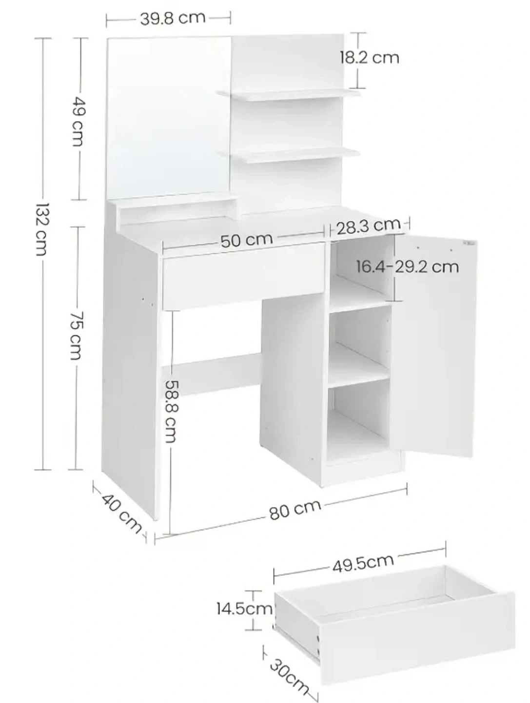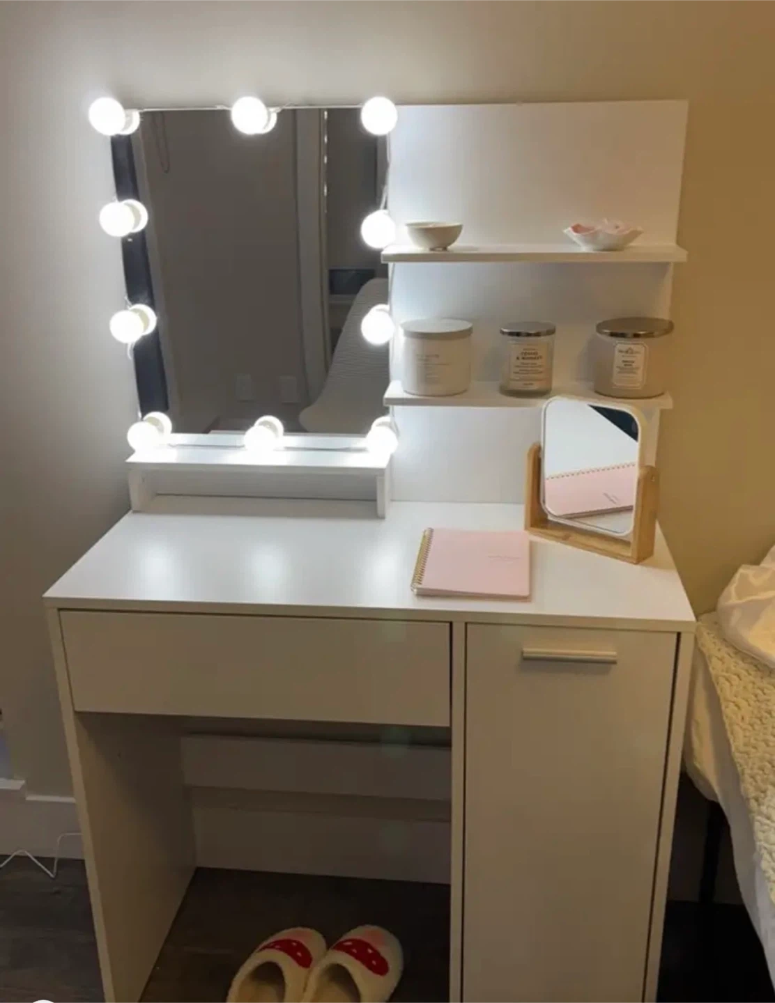 I bought this vanity a few months ago but barely used it, as I went on vacation shortly after. I now need a computer desk, and since I don’t have space for both, I’ve decided to sell the vanity. It has a small crack on the bottom shelf, but it’s not deep and isn’t visible from the outside. It arrived that way, and I noticed it only after assembling, so I decided to keep it rather than go through disassembling and returning it. Light not included. Pick-up only. Cash payment.