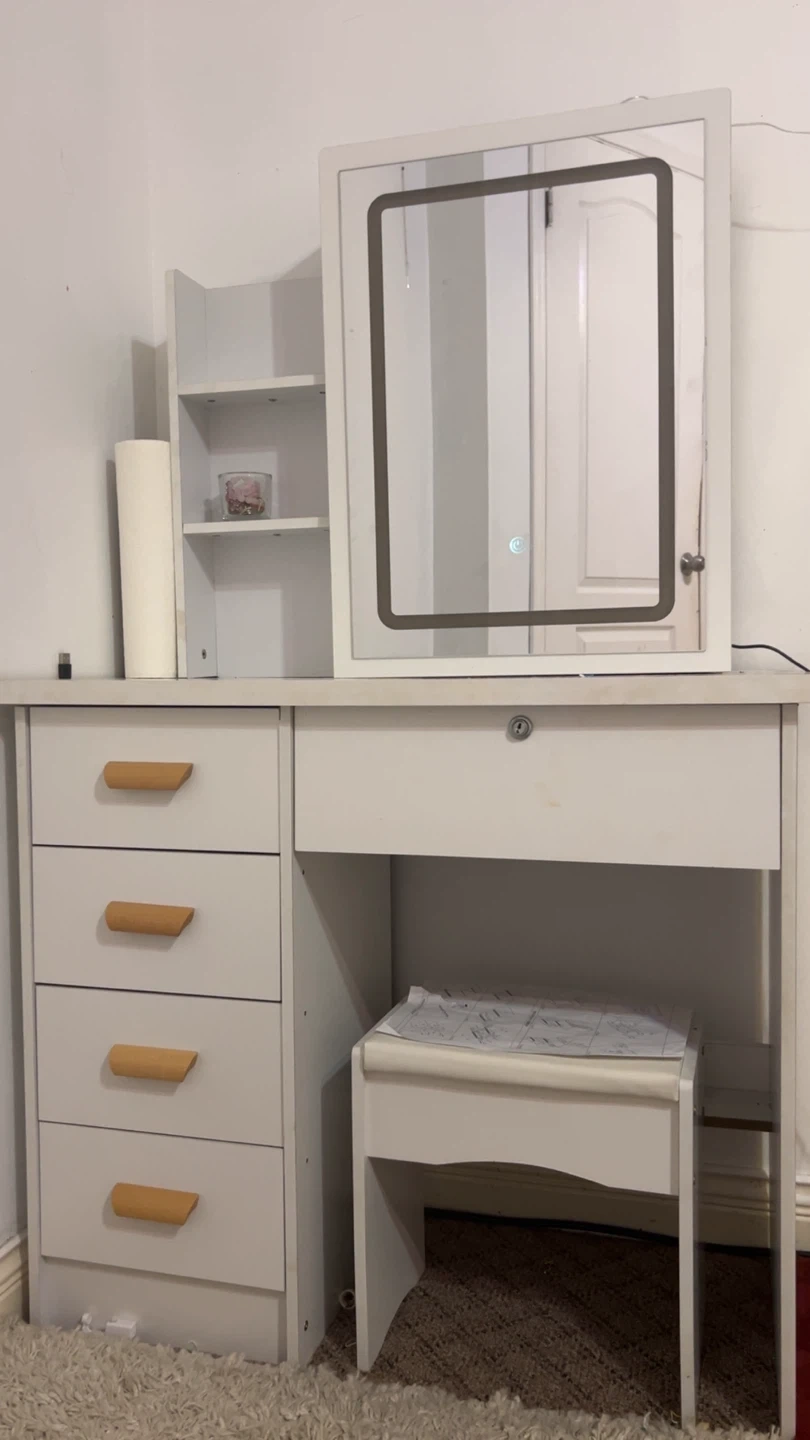 10Selling a vanity makeup table, perfect for getting ready! It comes with a mirror and a matching stool. The vanity features drawers for storage and a sleek, modern design. Great for adding a touch of elegance to your bedroom or dressing area
