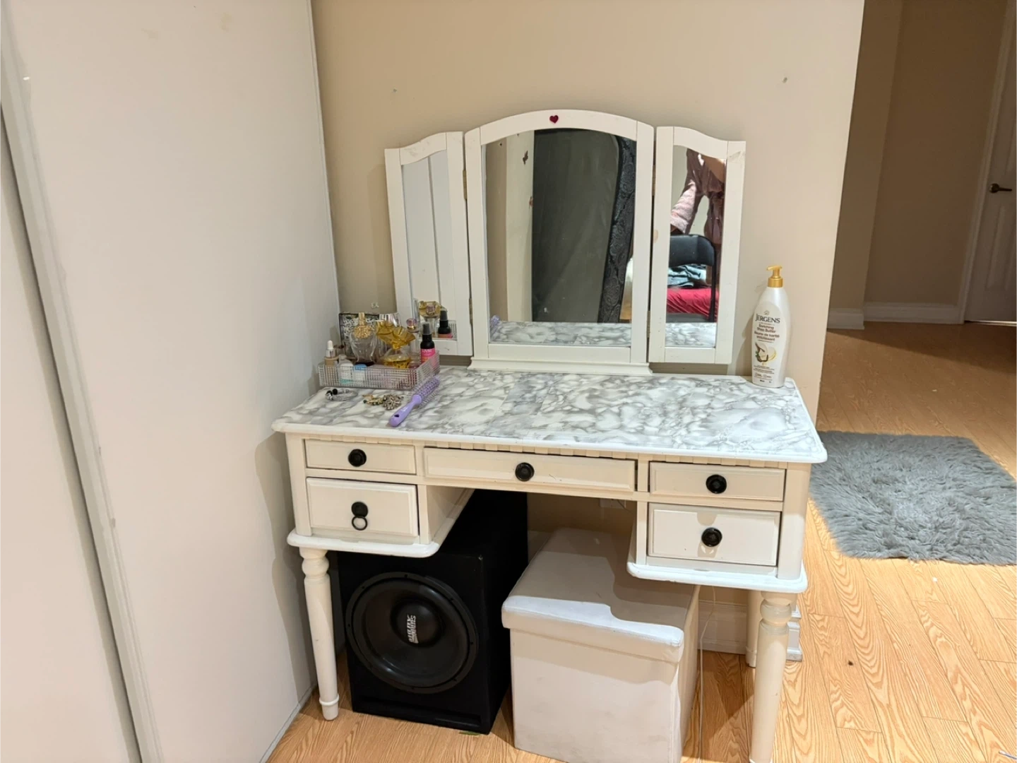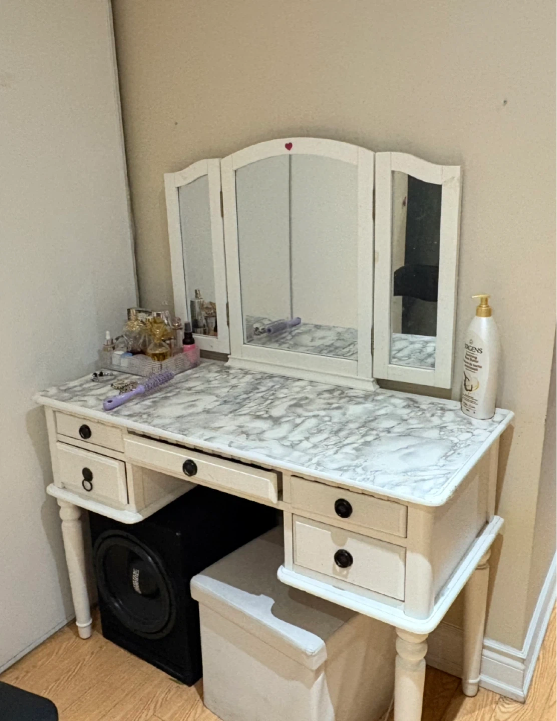 Selling a lovely white vanity table with a marble-look top and a three-panel mirror. It's perfect for getting ready in the morning or adding a touch of elegance to your room. Has some drawers for storage too! Features: • Classic white design with black knobs • Spacious 5 drawers for makeup, jewelry, or accessories • Durable marble-look top surface • Includes matching stool for comfort • Sturdy build, in great condition Perfect for bedrooms, dressing rooms, or anyone who loves an organized and stylish space! 📍 Pick-up only 💰 Asking Price: [$50] Message me if interested!