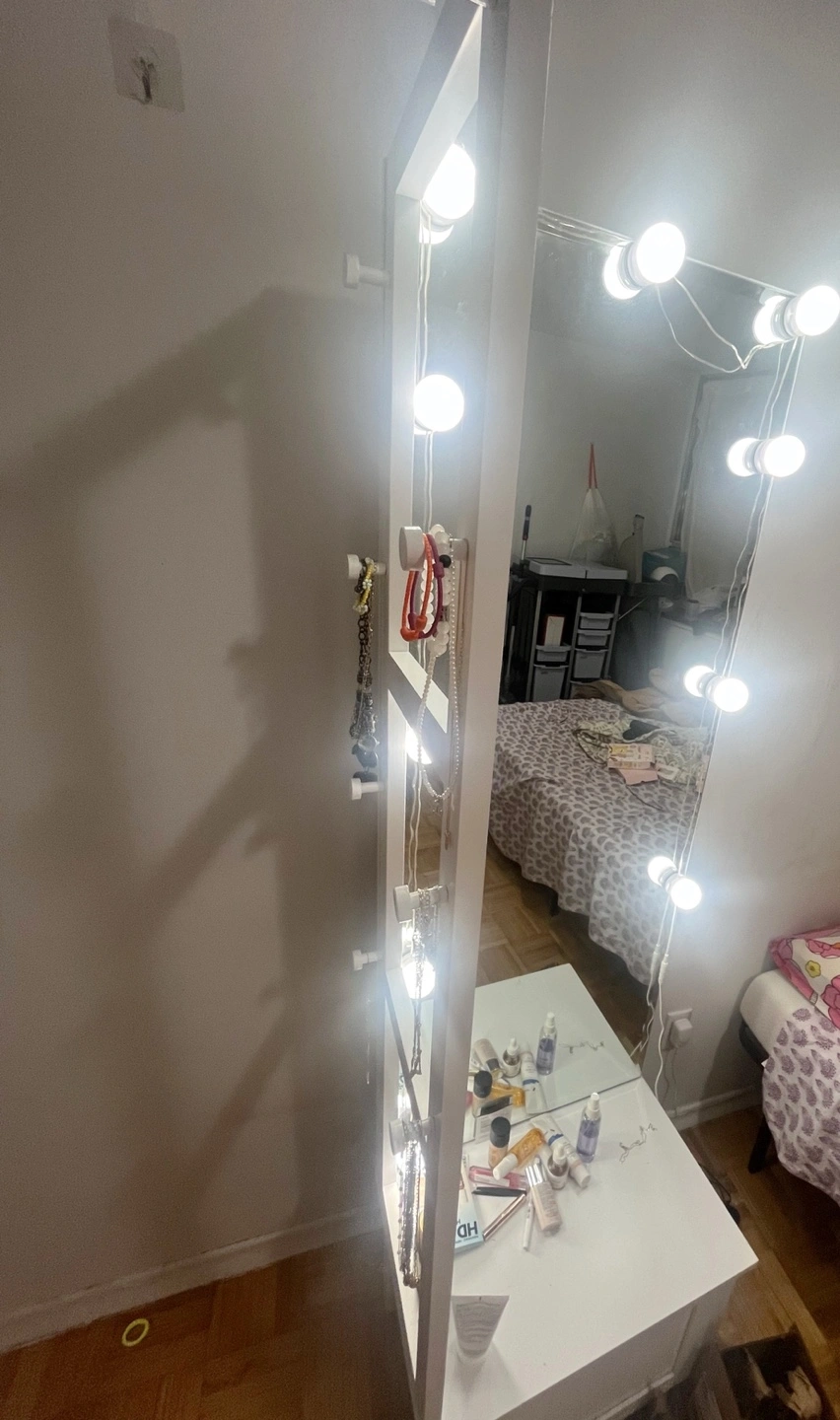 272White vanity mirror with lights, includes a small attached table. Mirror is full length and has a shelf on one side. Also, can be dismantled