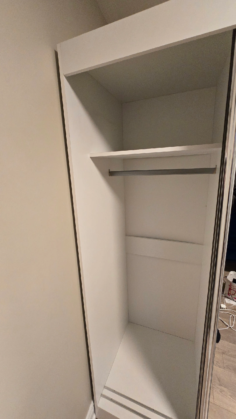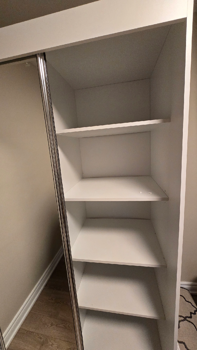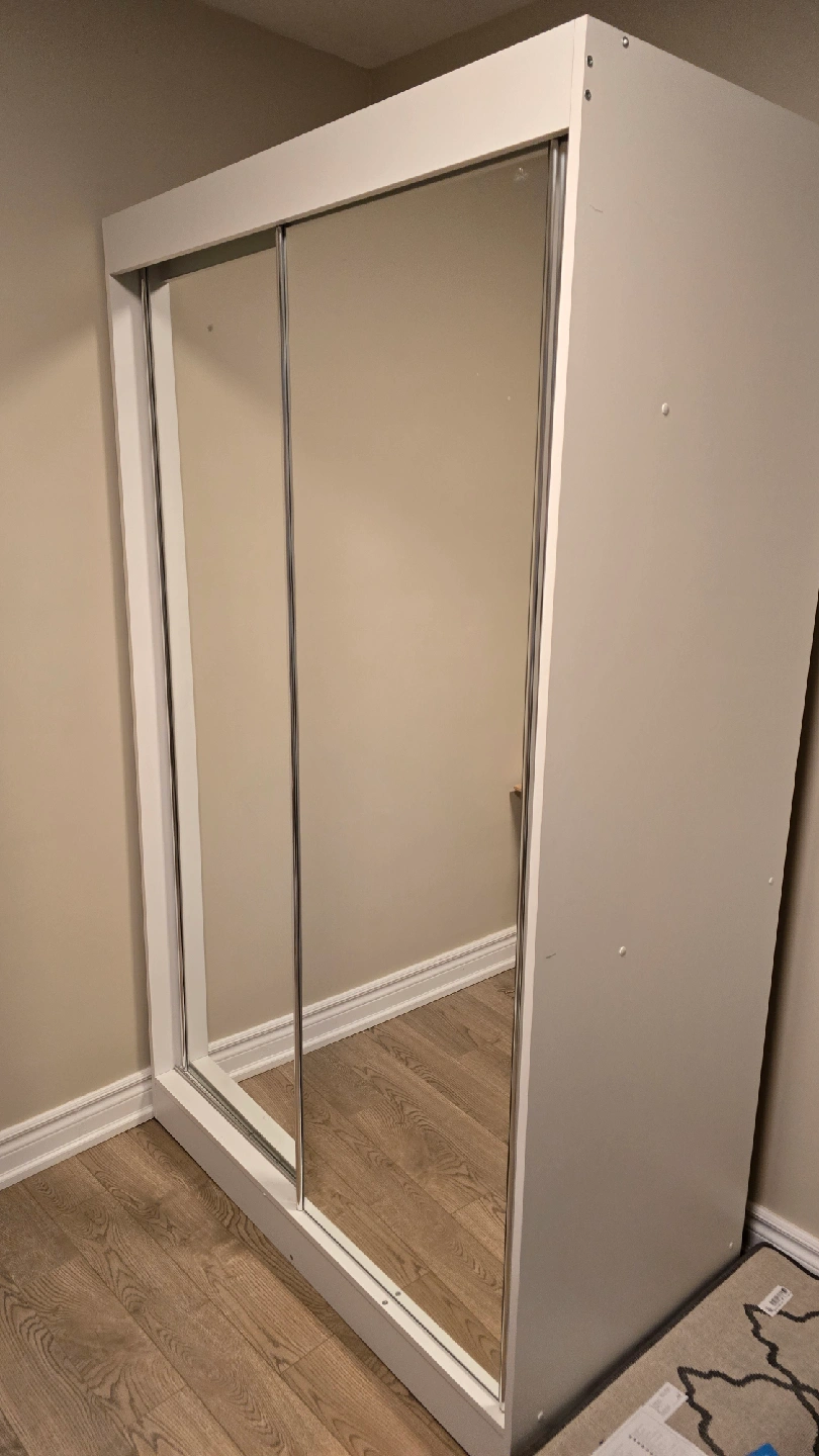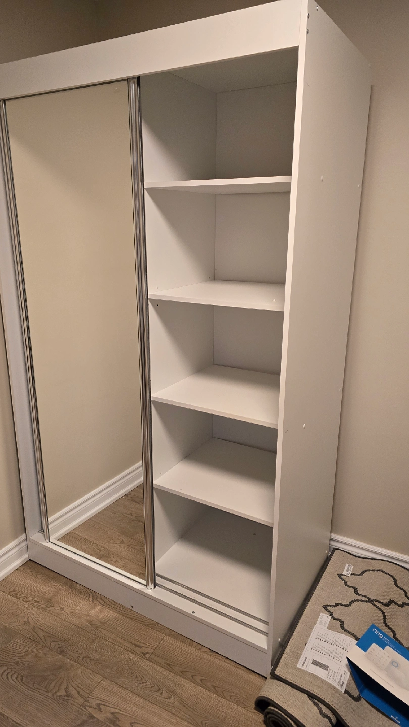 15Wardrobe with mirror sliding doors in great condition! It has multiple shelves for storage and a sleek, modern look. Perfect for organizing your clothes and accessories pick up and cash only
