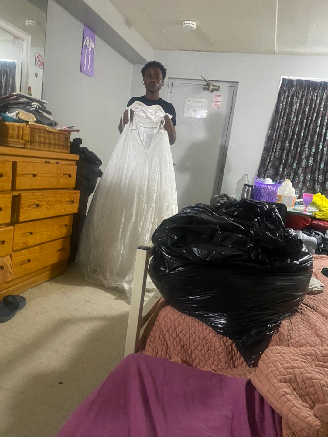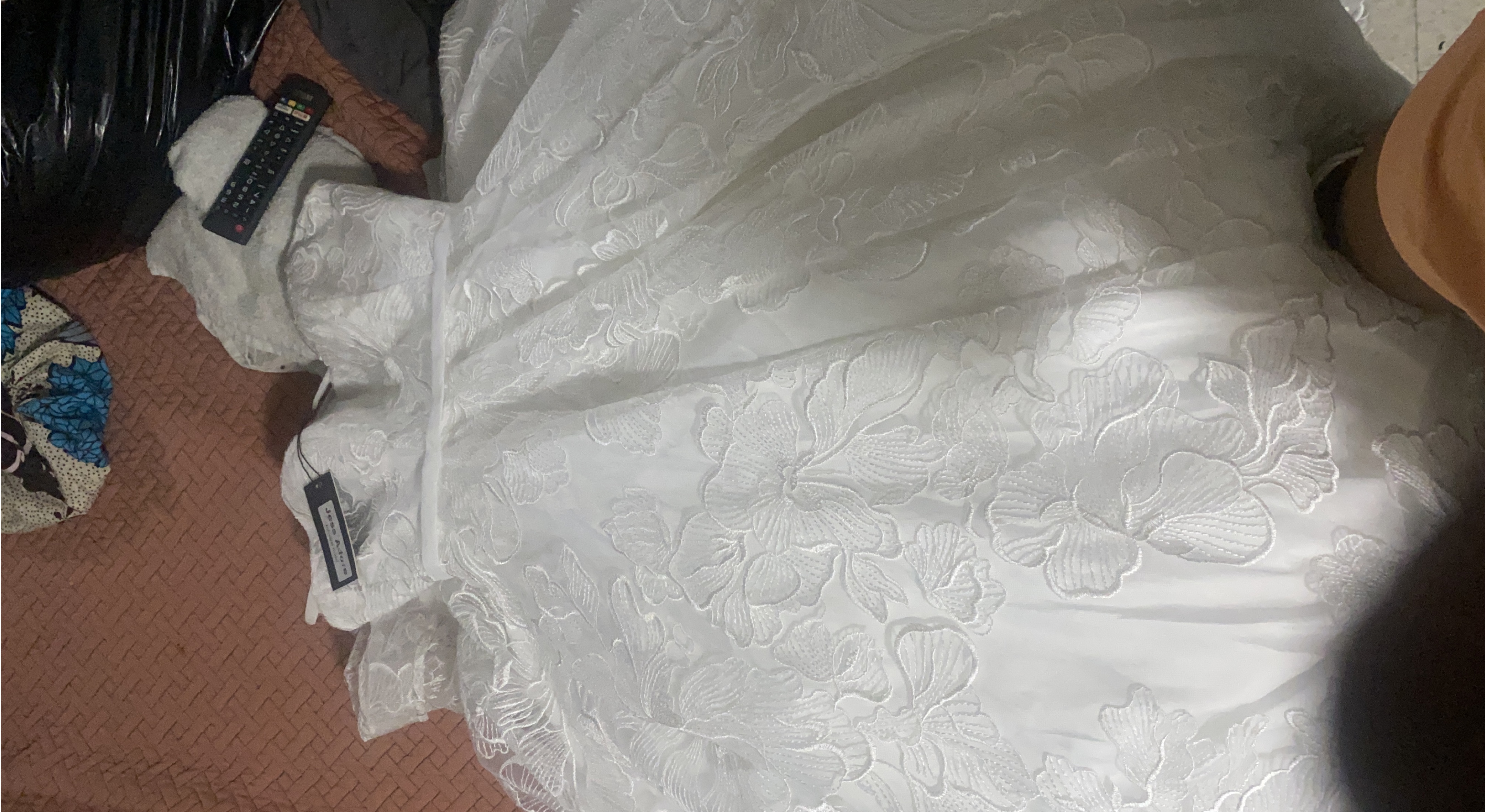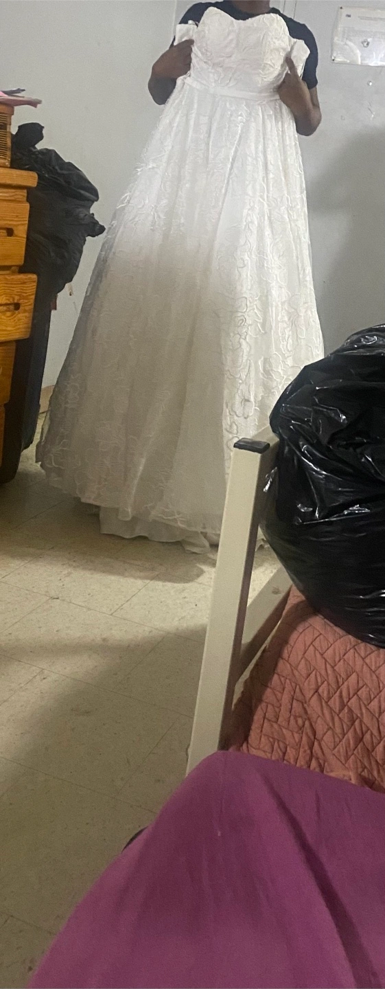 Selling a beautiful white wedding dress. It has a lovely floral pattern and a classic design. Perfect for your special day!