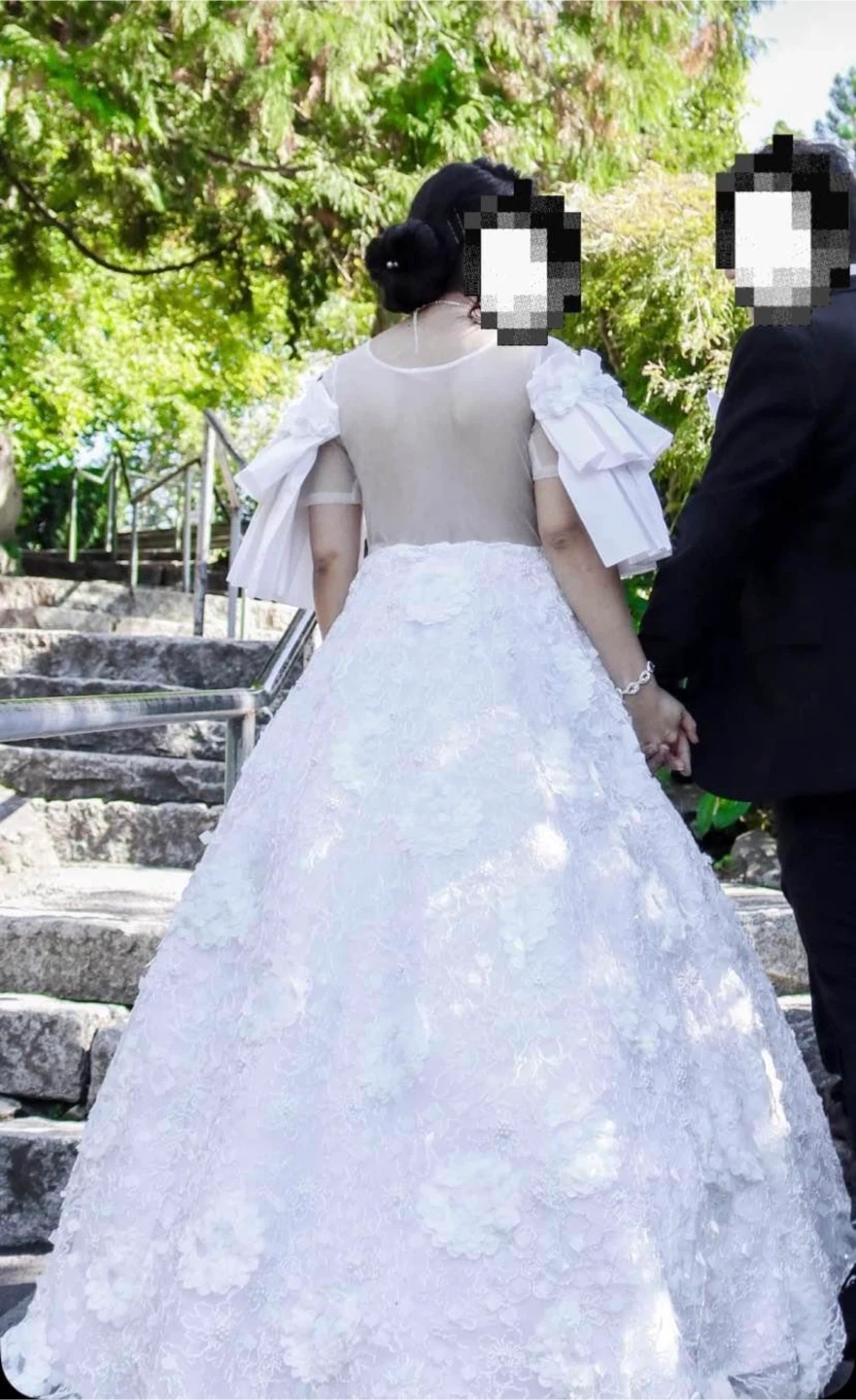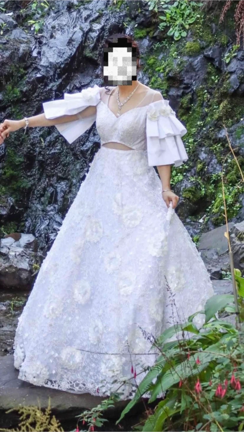 10Selling a beautiful white wedding dress. It has a unique design with floral details and ruffled sleeves. Perfect for your special day!