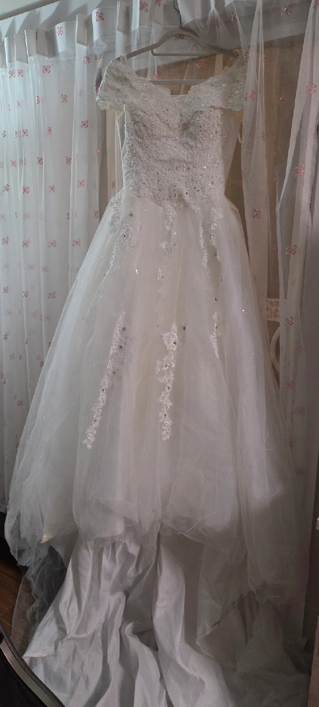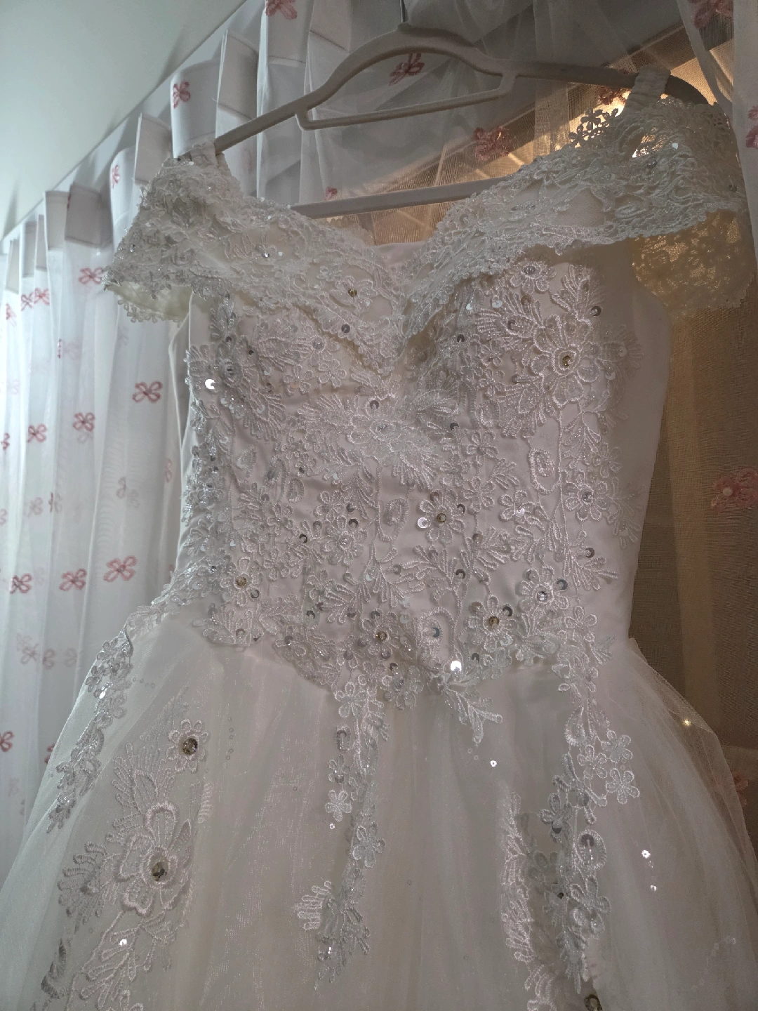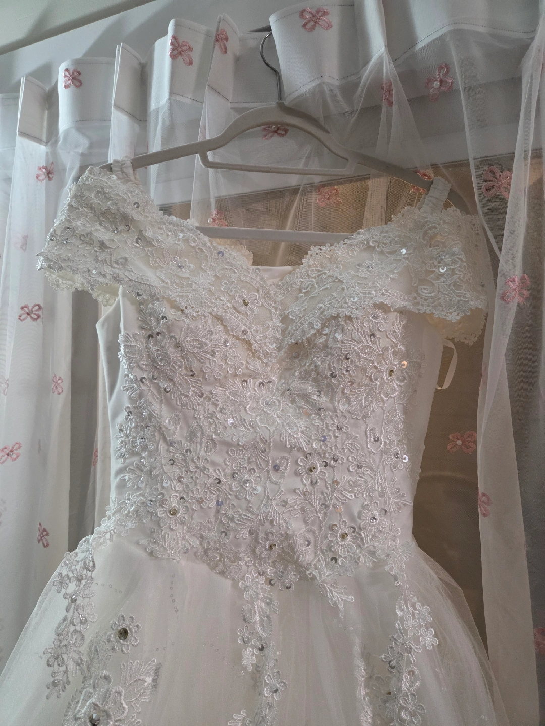 Beautiful white wedding dress with intricate lace and sequin detailing. It features an off-the-shoulder neckline and a corset back. Perfect for your special day!