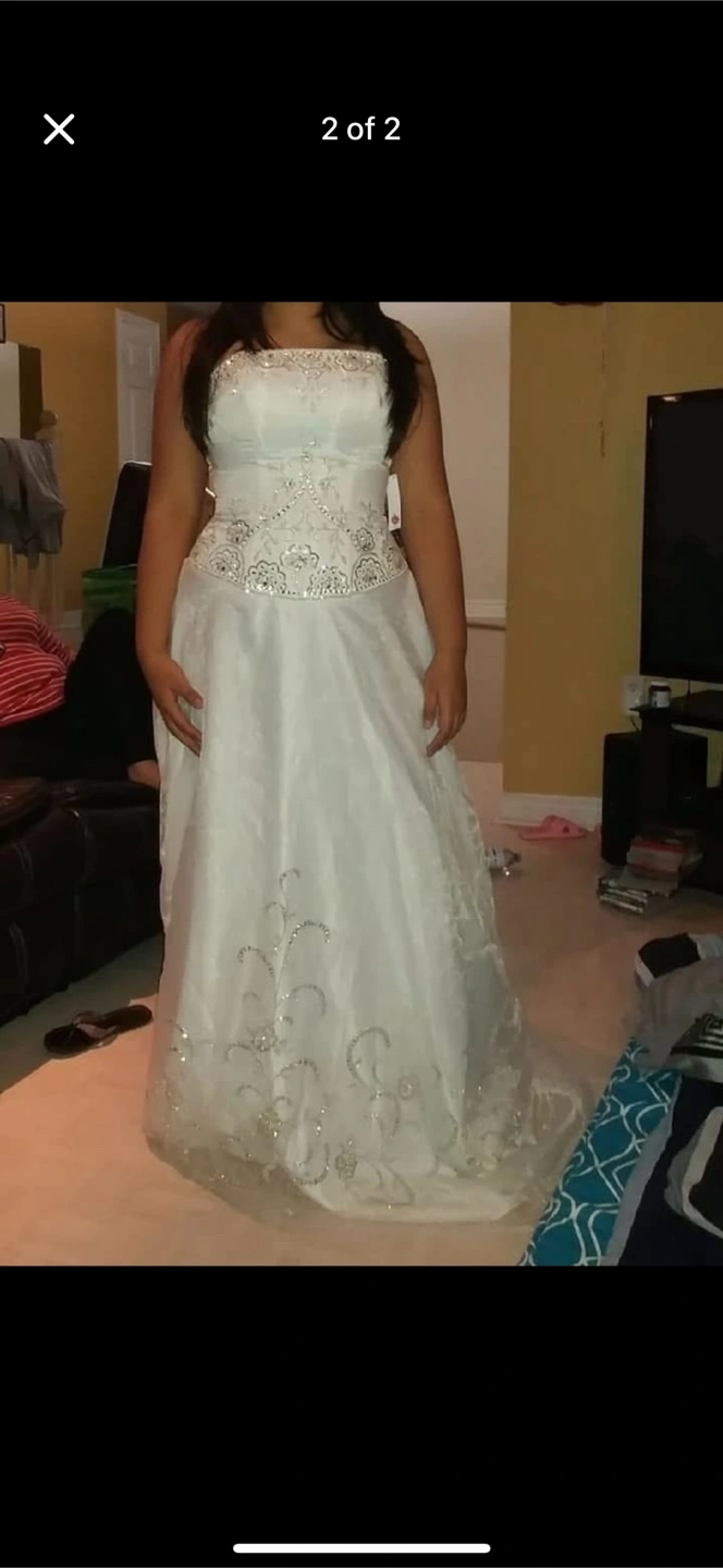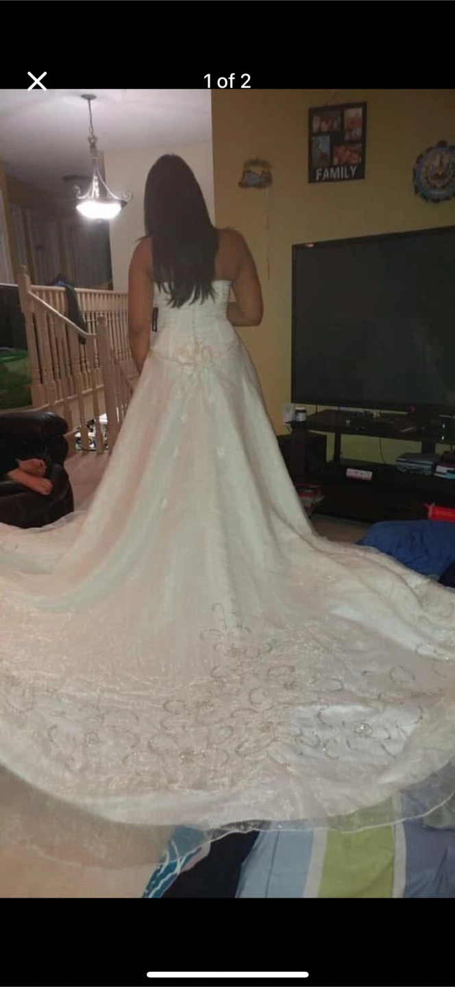 Selling a beautiful white wedding dress. It features delicate detailing throughout the bodice and skirt. Perfect for your special day! Just tryed for the picture