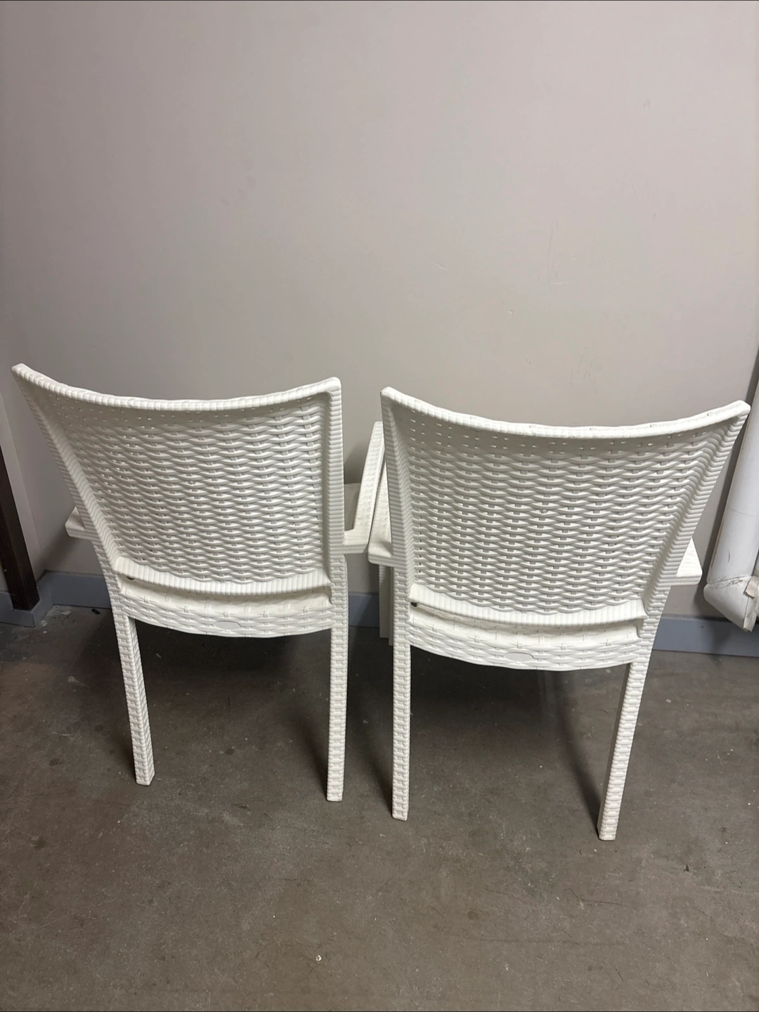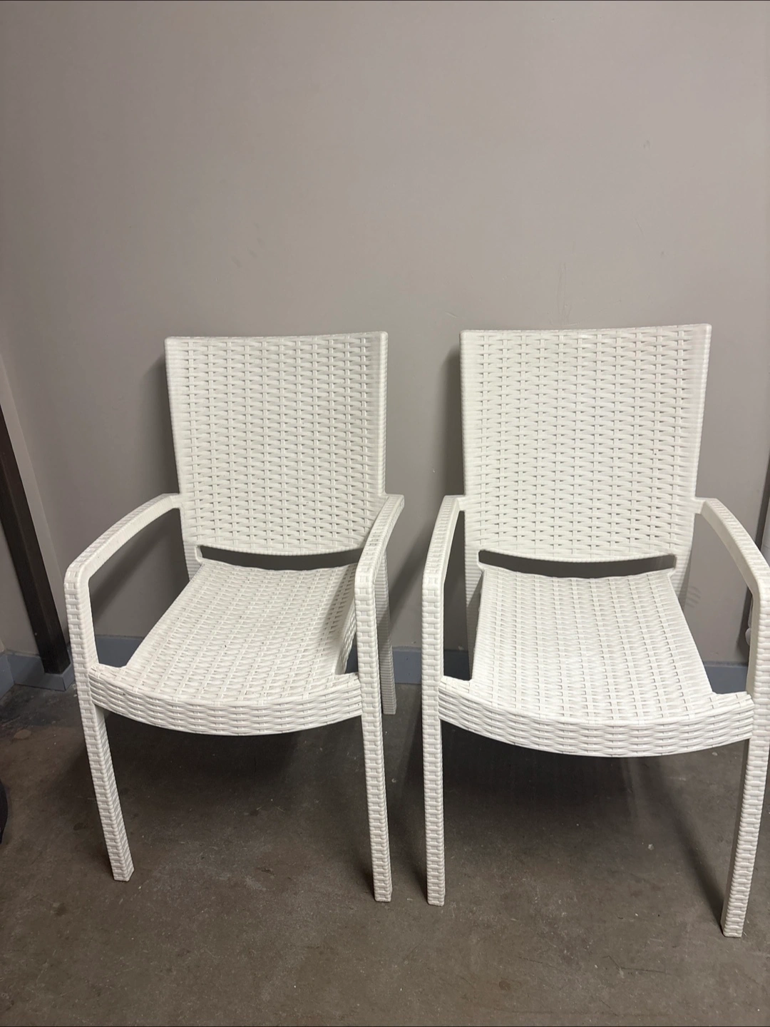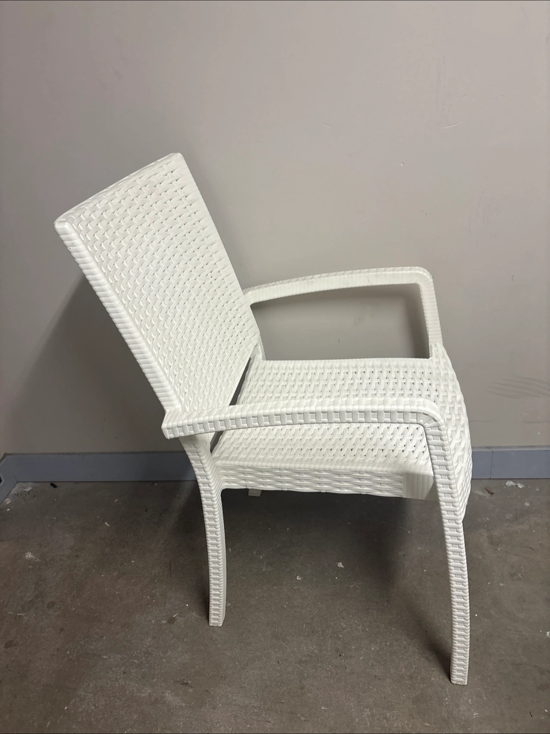 Selling a white wicker-style patio chair! It's perfect for adding a touch of summery style to your outdoor space, balcony, or even indoors. The chair is in great condition and ready for a new home. It's lightweight and easy to move around, making it ideal for creating a cozy seating area wherever you need it