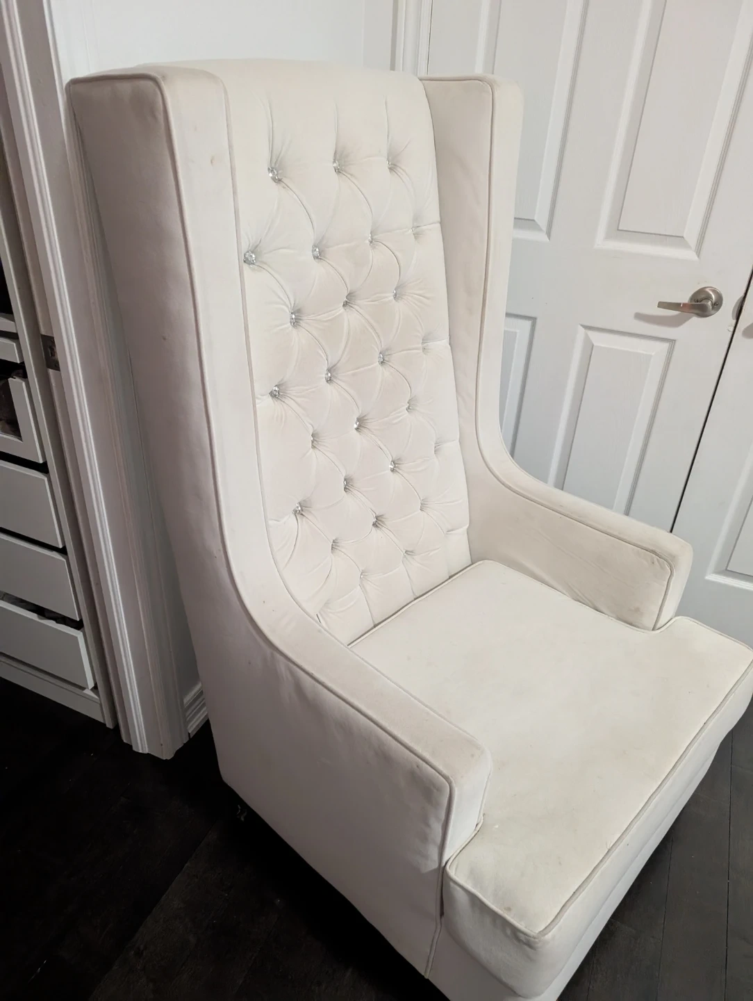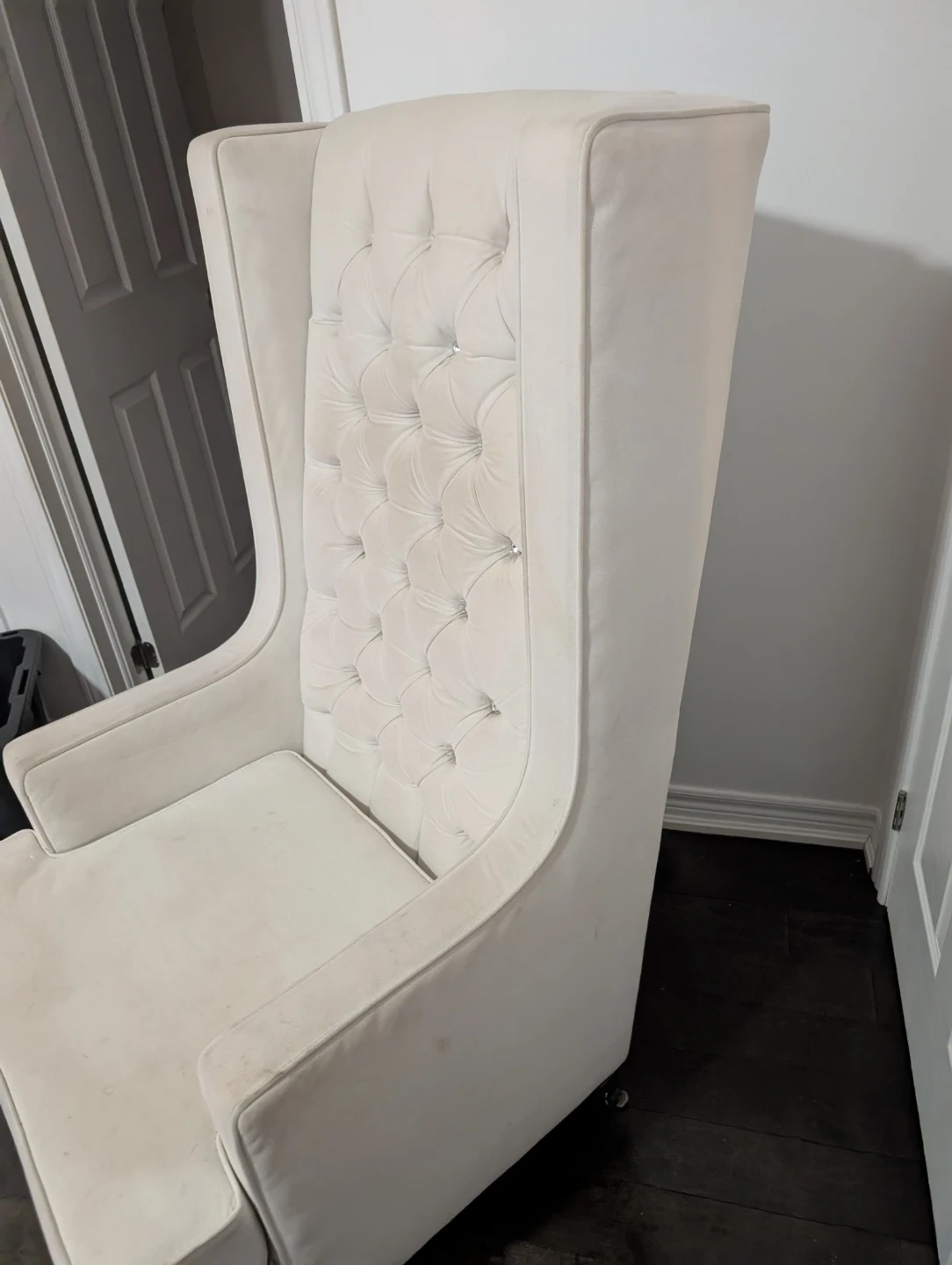 65Two set of Stylish and comfortable white wingback accent chairs in good condition. They simply need a quick shampoo to refresh the fabric. Perfect for adding a touch of elegance to your living room, bedroom, or office.