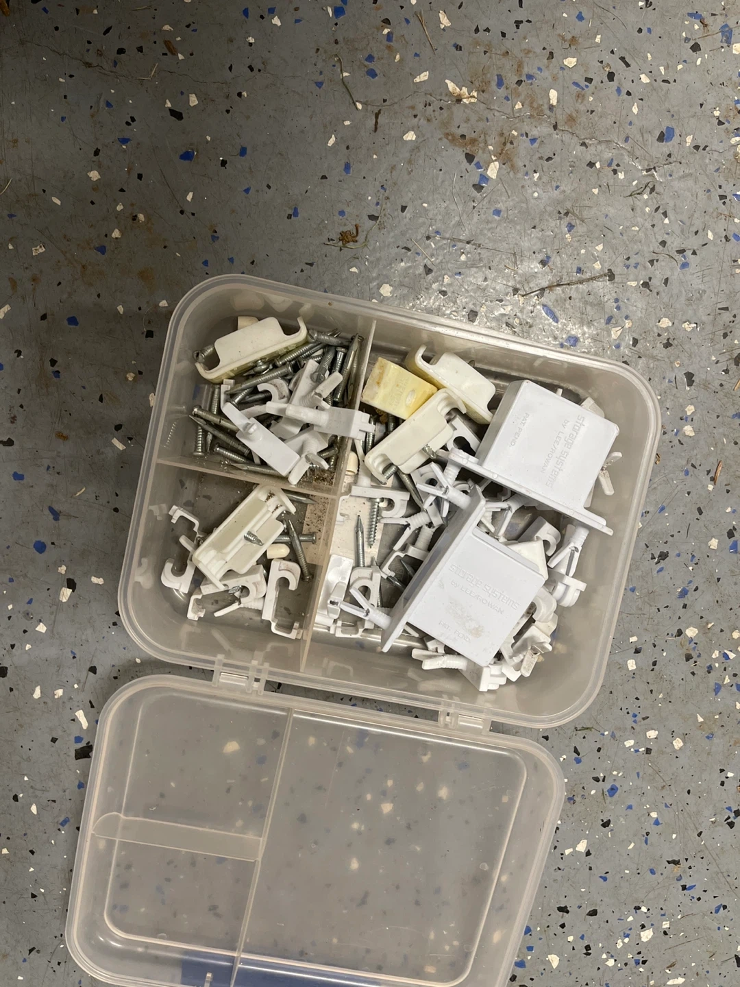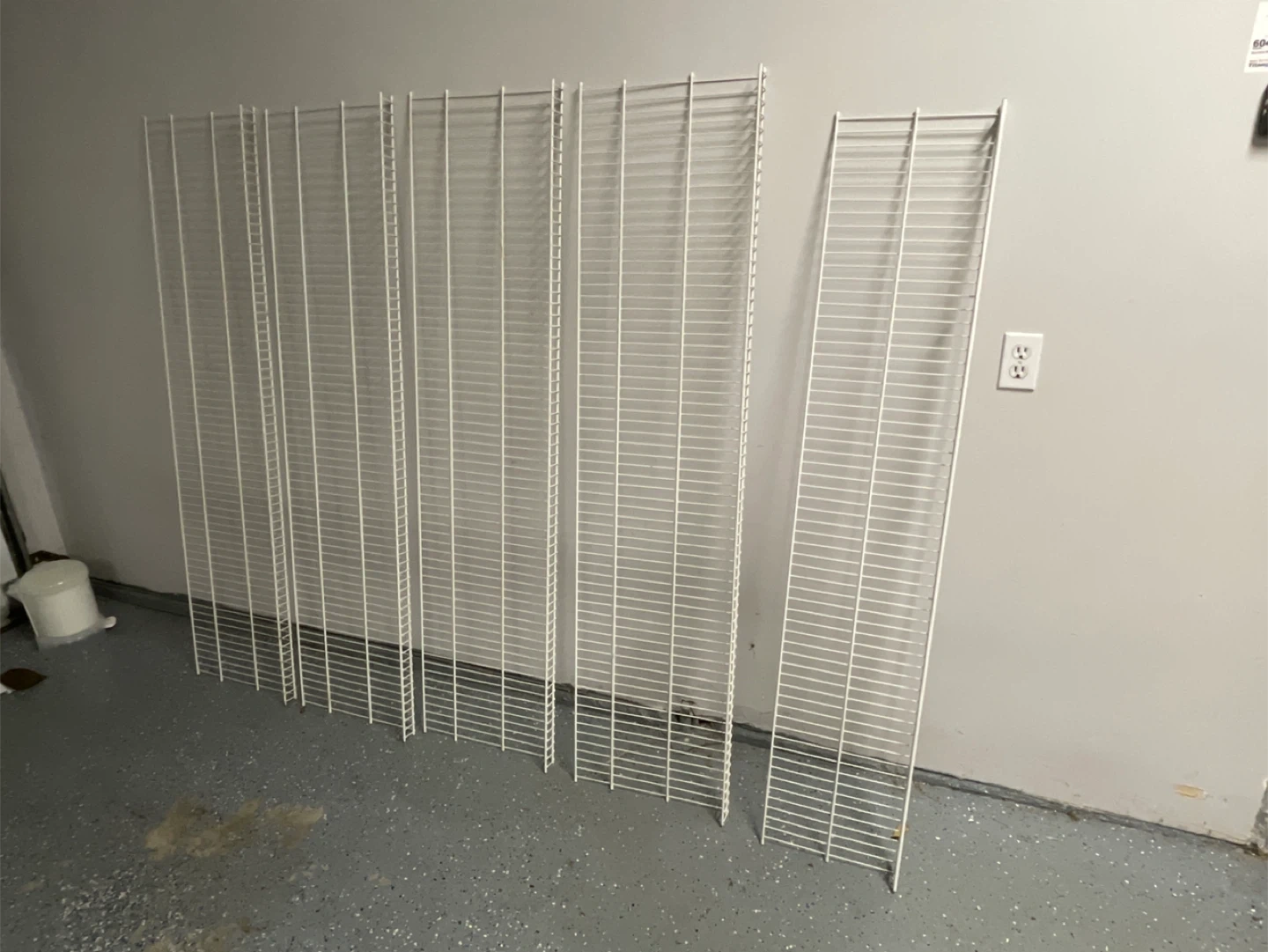 81Selling a set of white wire shelving and a basket. Also includes a container of assorted clips and hardware. Great for organizing your garage or storage space!