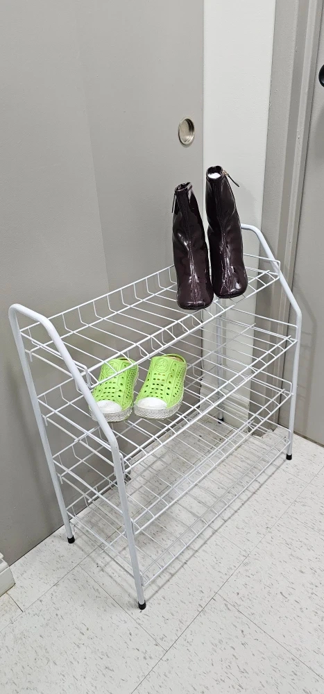 1000+Selling a handy three-tier shoe rack! It's perfect for keeping your entryway or closet organized. The white wire design is simple and clean, fitting in with any decor. It's in great condition and ready for a new home! measures are in inches