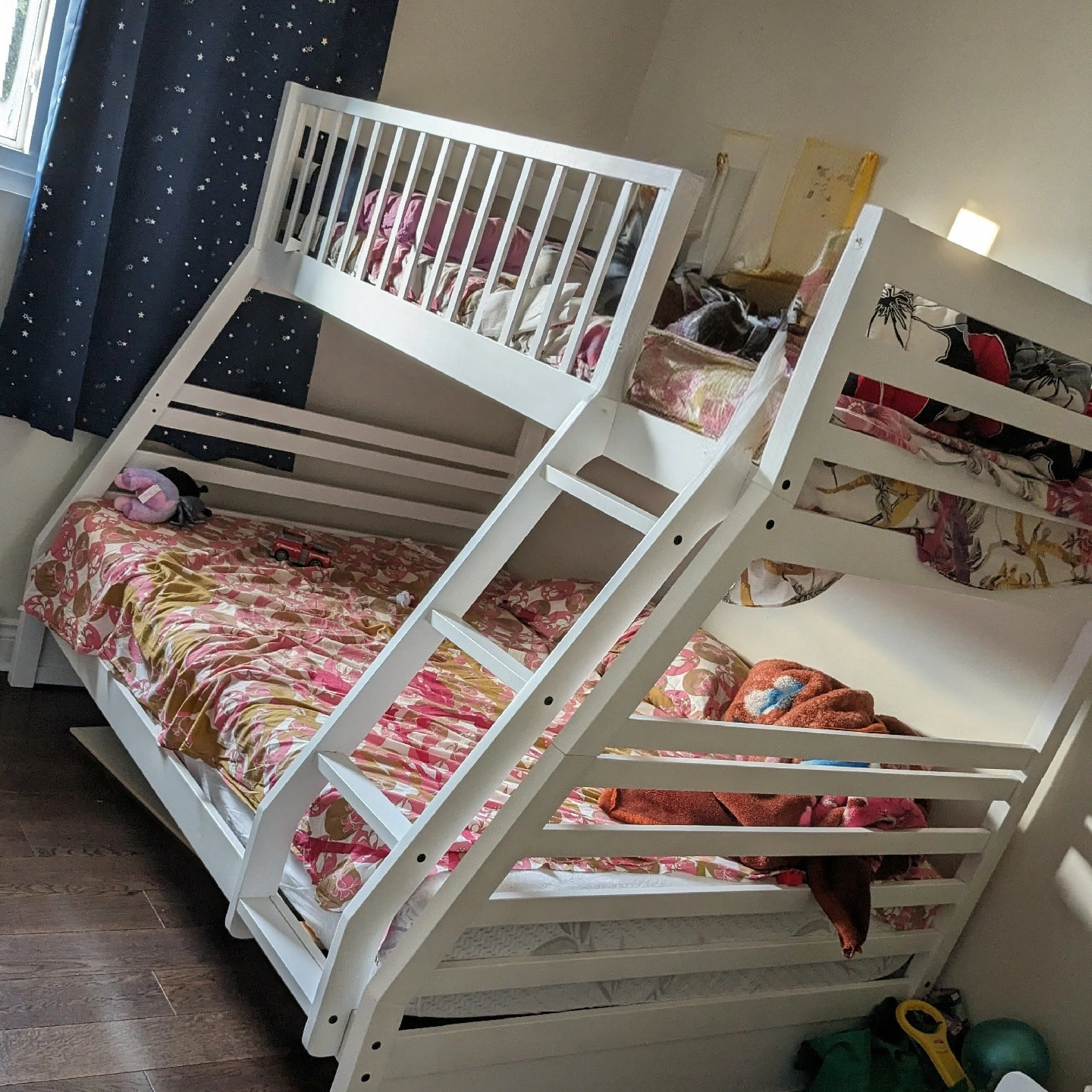 Brand new, never used due to travel. Dimensions-79”L x 57”W x 65”H. Made of solid wood and reinforced throughout, our bunk beds are built to last and remain durable and strong. This model can be split into two separate single/twin + double/full beds, making it a valuable option for future use. With convenient drawers, this model of bunk bed offers storage underneath for quick and easy storage. twin over full bunk bed – an elegant and functional addition to your bedroom, combining timeless design with versatile features. In pristine white and crafted from solid wood, it seamlessly blends sophistication and practicality. Designed for organization, it includes two spacious storage drawers beneath, offering a stylish solution for a clutter-free space. With a robust frame supporting 250lbs on the top bunk and 420lbs on the bottom, safety is prioritized. Its adaptability shines as it effortlessly transforms into two separate beds, catering to changing needs and room layouts. The platform base design eliminates the need for box springs, streamlining setup for a comfortable foundation.
