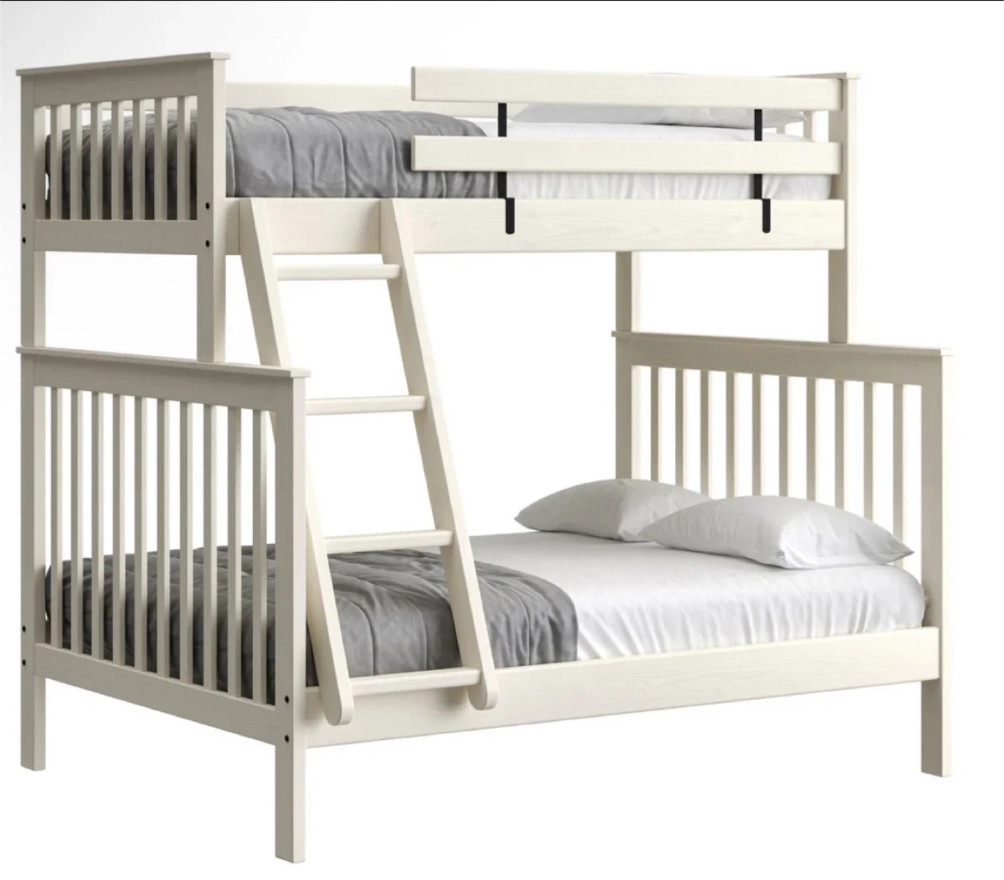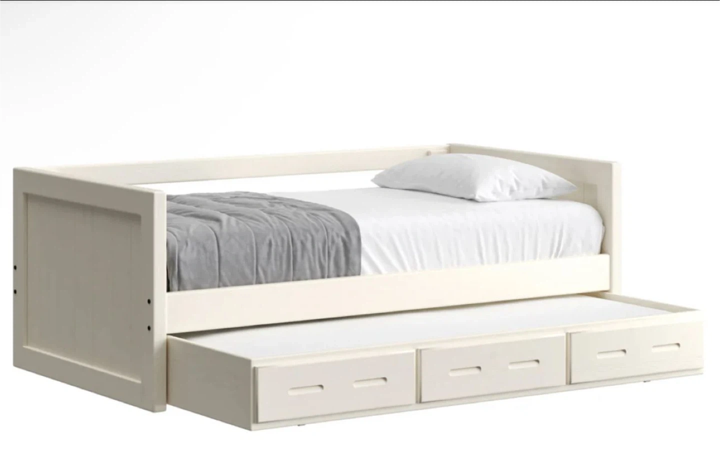 Selling a bunk bed frame with a trundle. It's in great shape and ready for a new home! The frame is a clean white wood, perfect for any kids' room or guest room. The trundle provides extra sleeping space or can be used for storage. It's a versatile and practical piece of furniture