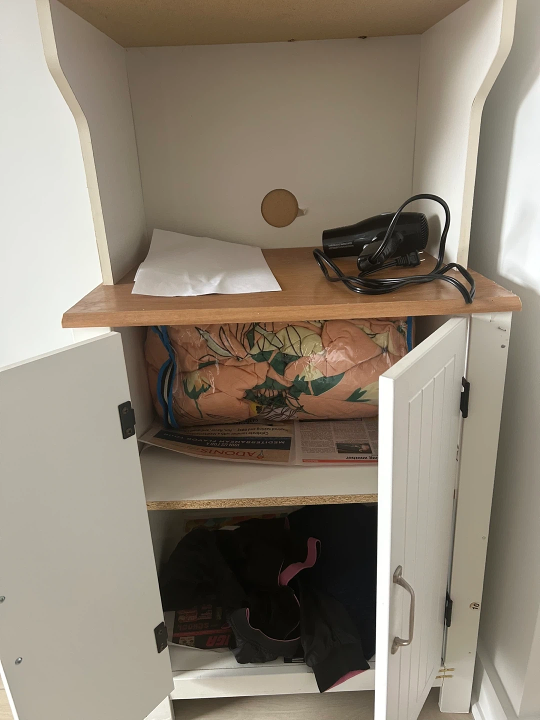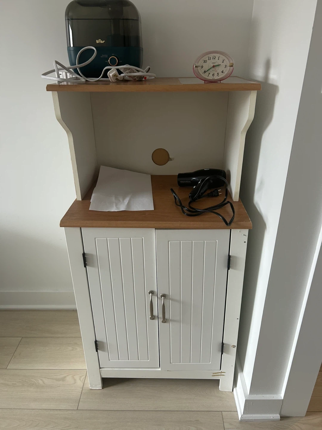 10Selling a cabinet with a white finish and wood top. It has two doors and an open shelf on top. Perfect for extra storage in your small space. It is used and have fixed a few things , hence the cheaper price. Pick up only