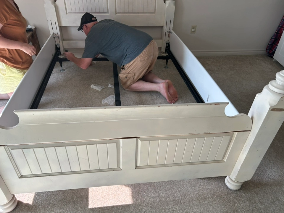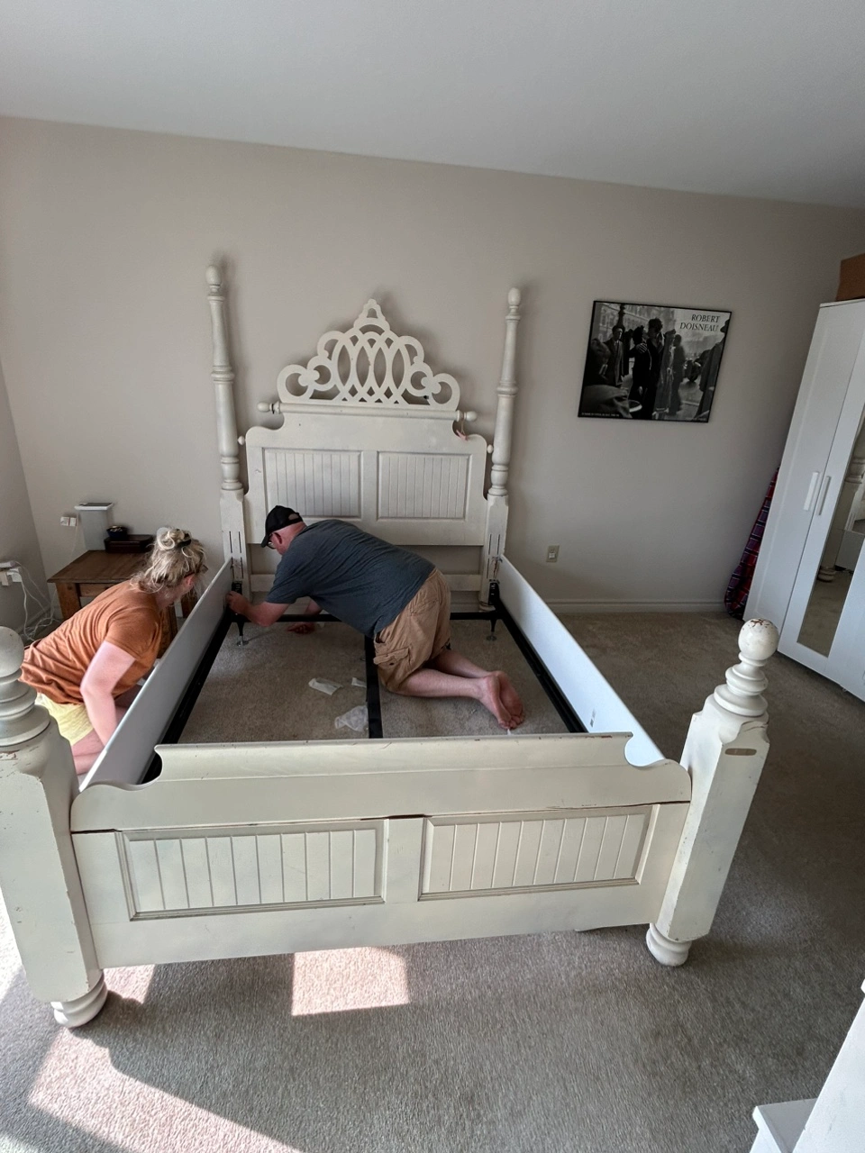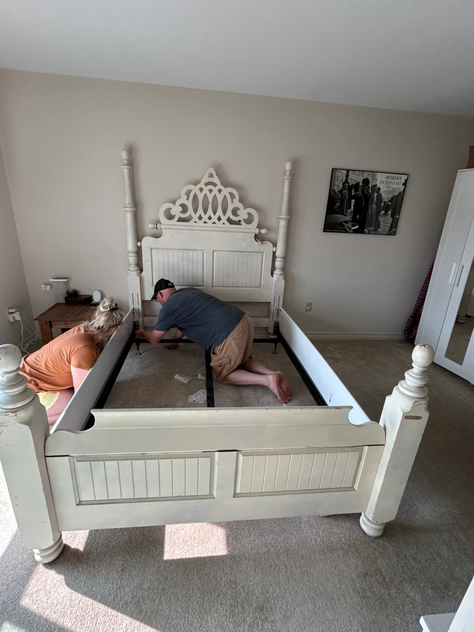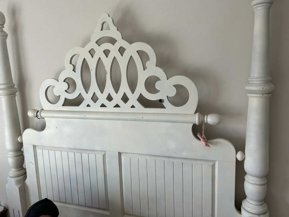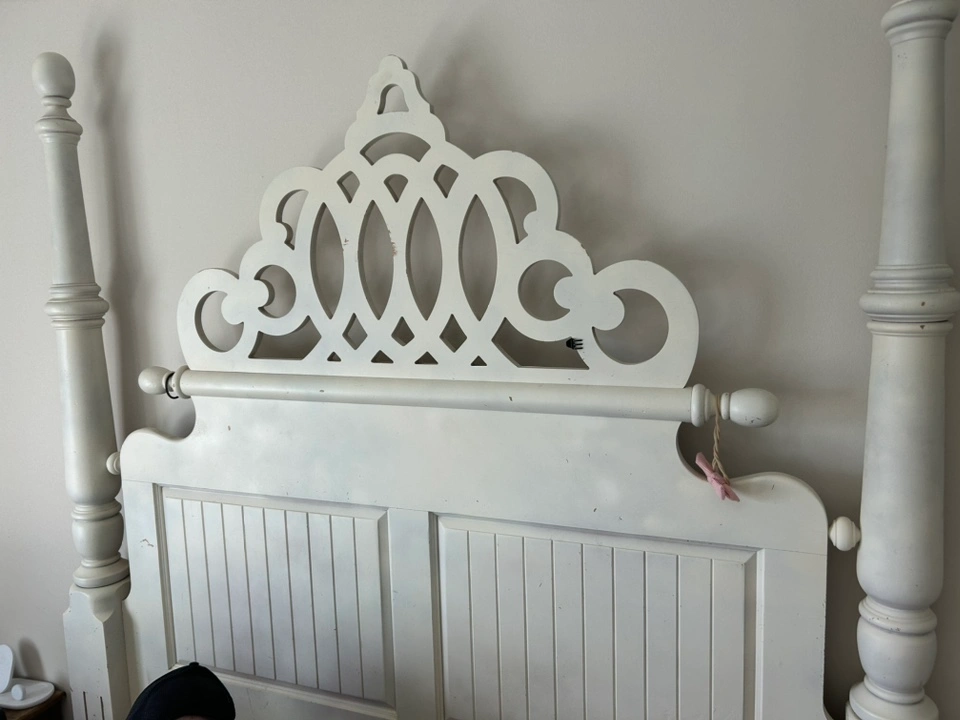 86Queen-sized poster bed frame with a beautiful ornate headboard. The frame is white and is made of wood. The headboard has an elegant design with a crown at the top. The footboard is a simple design & includes the metal bed frame insert. The bed frame is in good condition. The bed frame comes disassembled. Buyer must arrange for pick up.