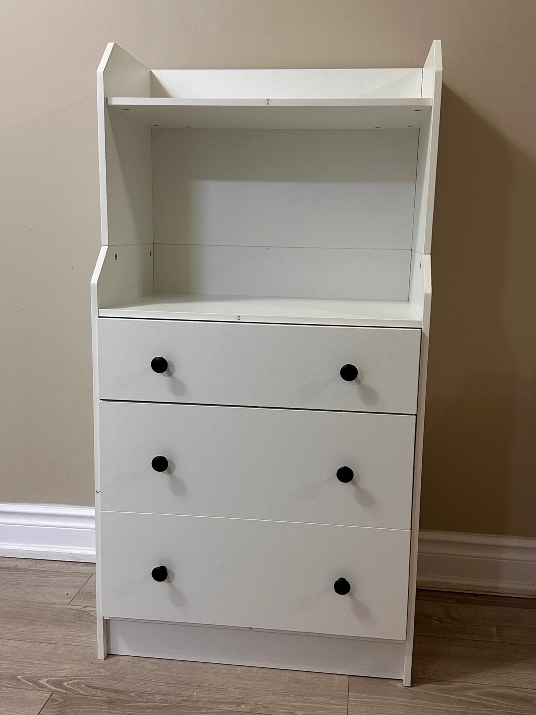 This brand new white three-drawer dresser with a built-in shelf is ideal for a children's room or nursery and is in good condition. The black knobs add a modern touch to its classic design, offering both storage and display space. * Three spacious drawers for ample storage * Integrated top shelf for displaying books or decor * Compact design fits well in smaller spaces Looking to declutter your space? This dresser could be the perfect solution! If the ad's up, it's still available!