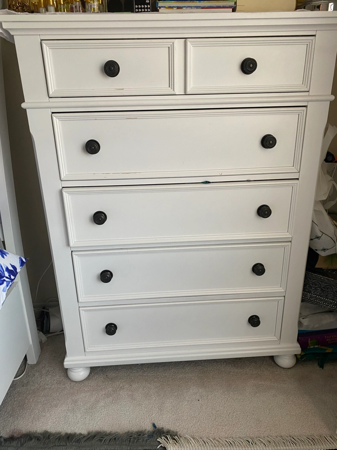 Selling a white wooden dresser with five drawers. It's in good condition and ready for a new home! Perfect for adding some extra storage to your bedroom or any other space in your home