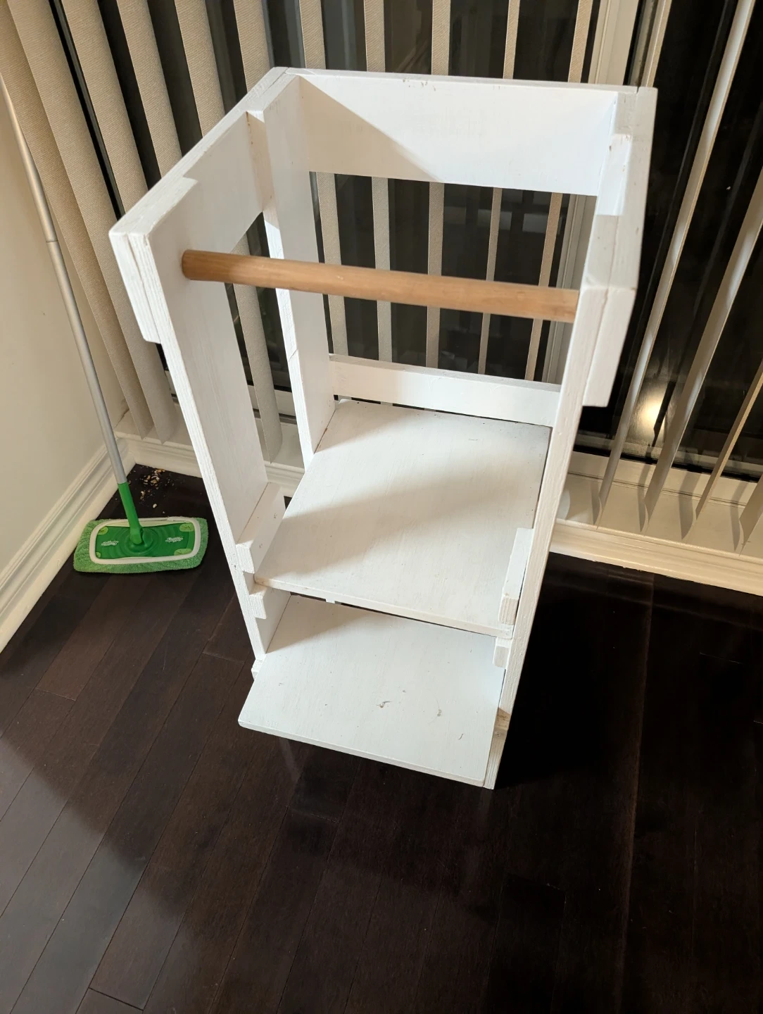 113Here's a handy learning tower for your little one! It's made of sturdy wood and painted white. Perfect for helping kids reach the counter safely and get involved in kitchen activities