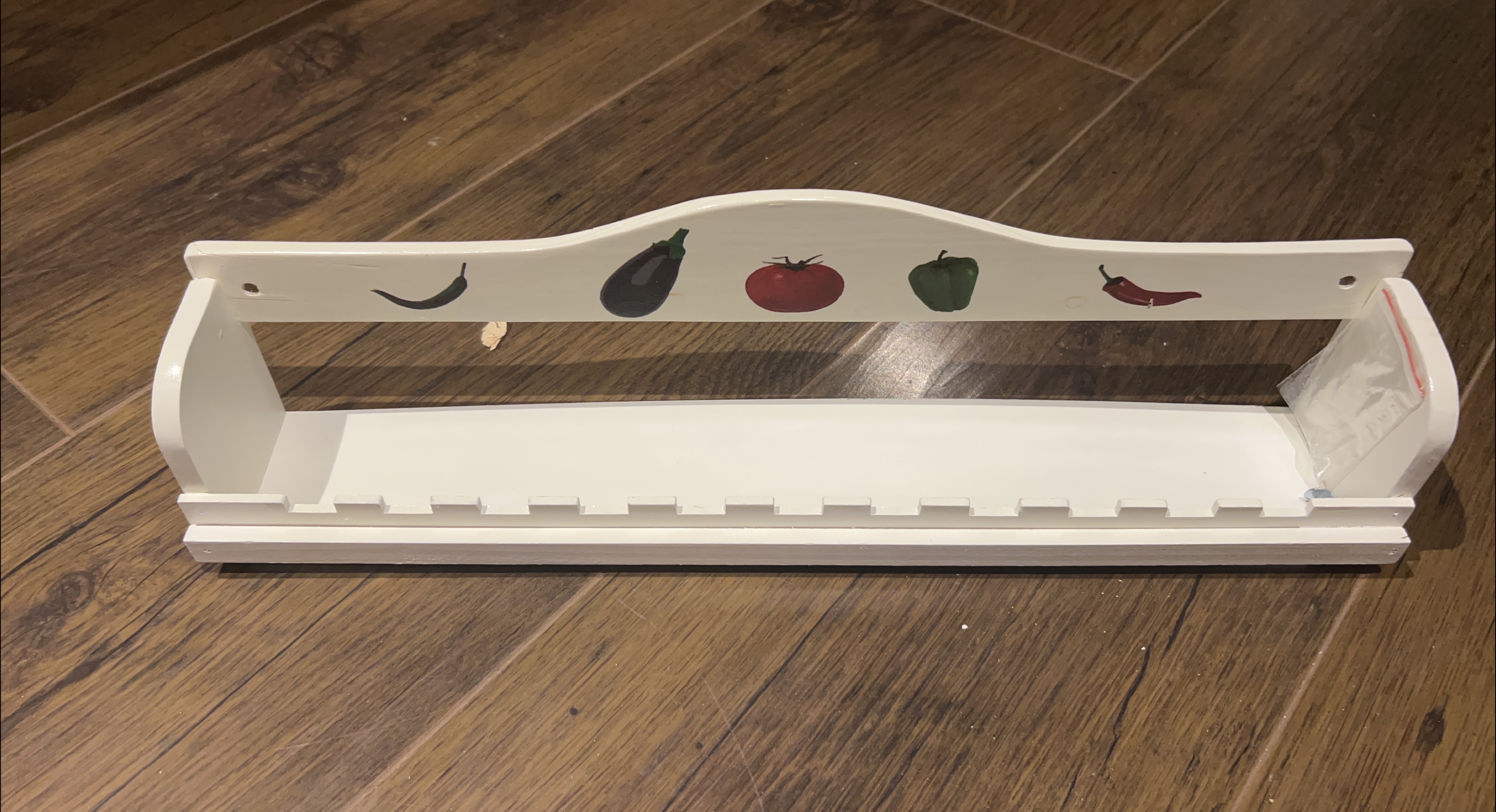 Selling a cute spice rack! It's white wood with a fun vegetable design along the top. Perfect for adding a touch of charm to your kitchen and keeping your spices organized