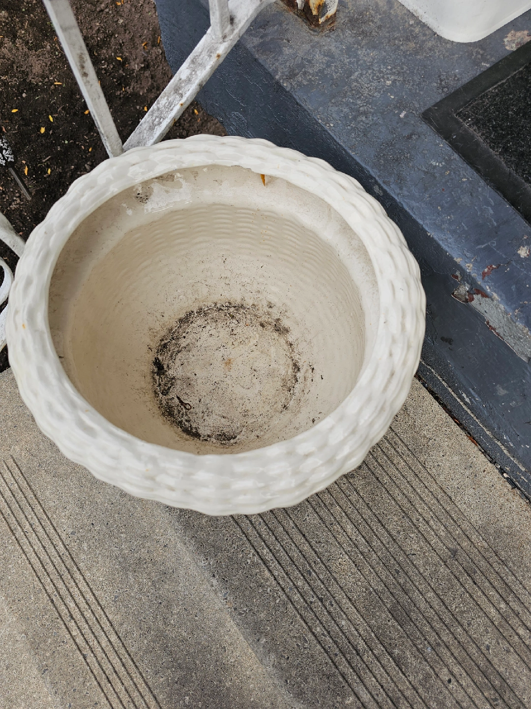 Here's a lovely white ceramic planter with a woven pattern! It's perfect for adding a touch of charm to your porch or garden. It's in good condition and ready to house your favourite plants. Just needs a quick rinse . See my ad for the 4 smaller ones!