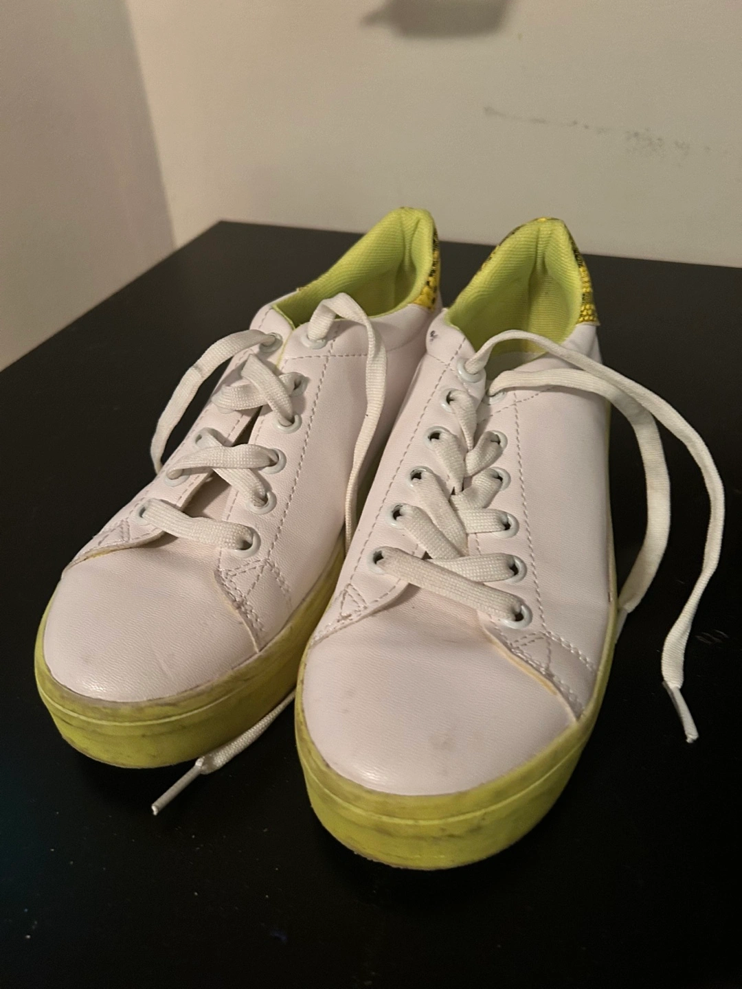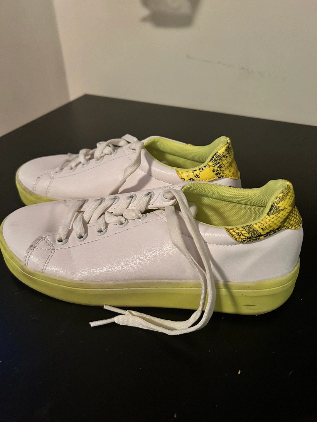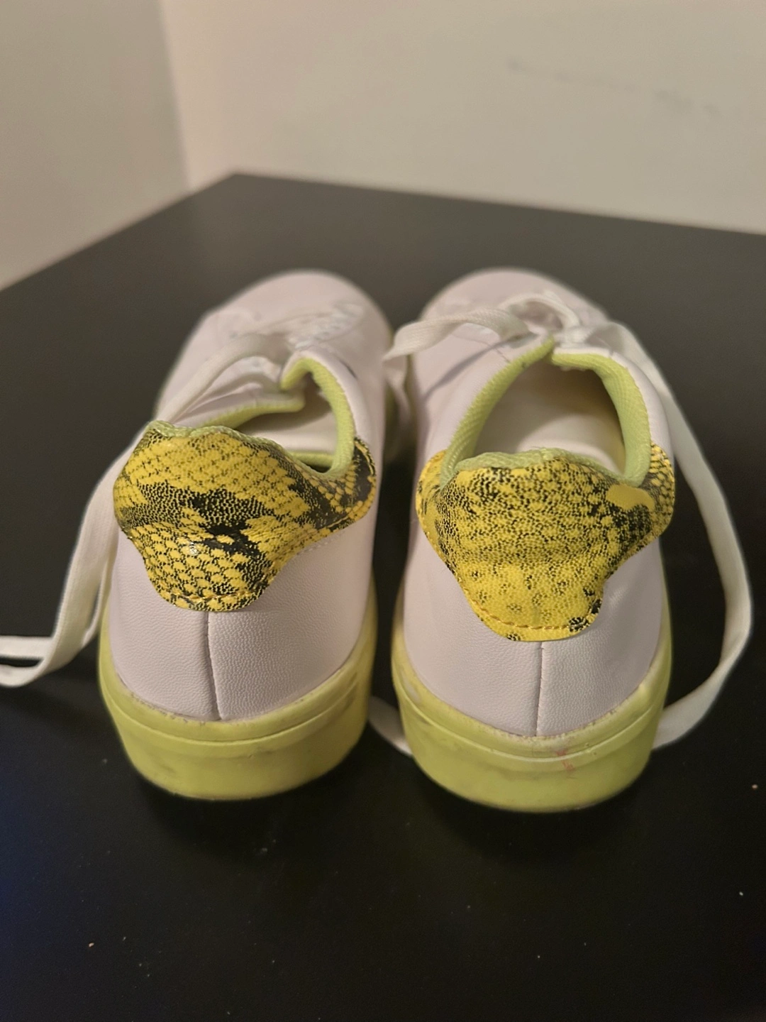White sneakers with a yellow platform and snakeskin detail on the back. Lace-up closure.