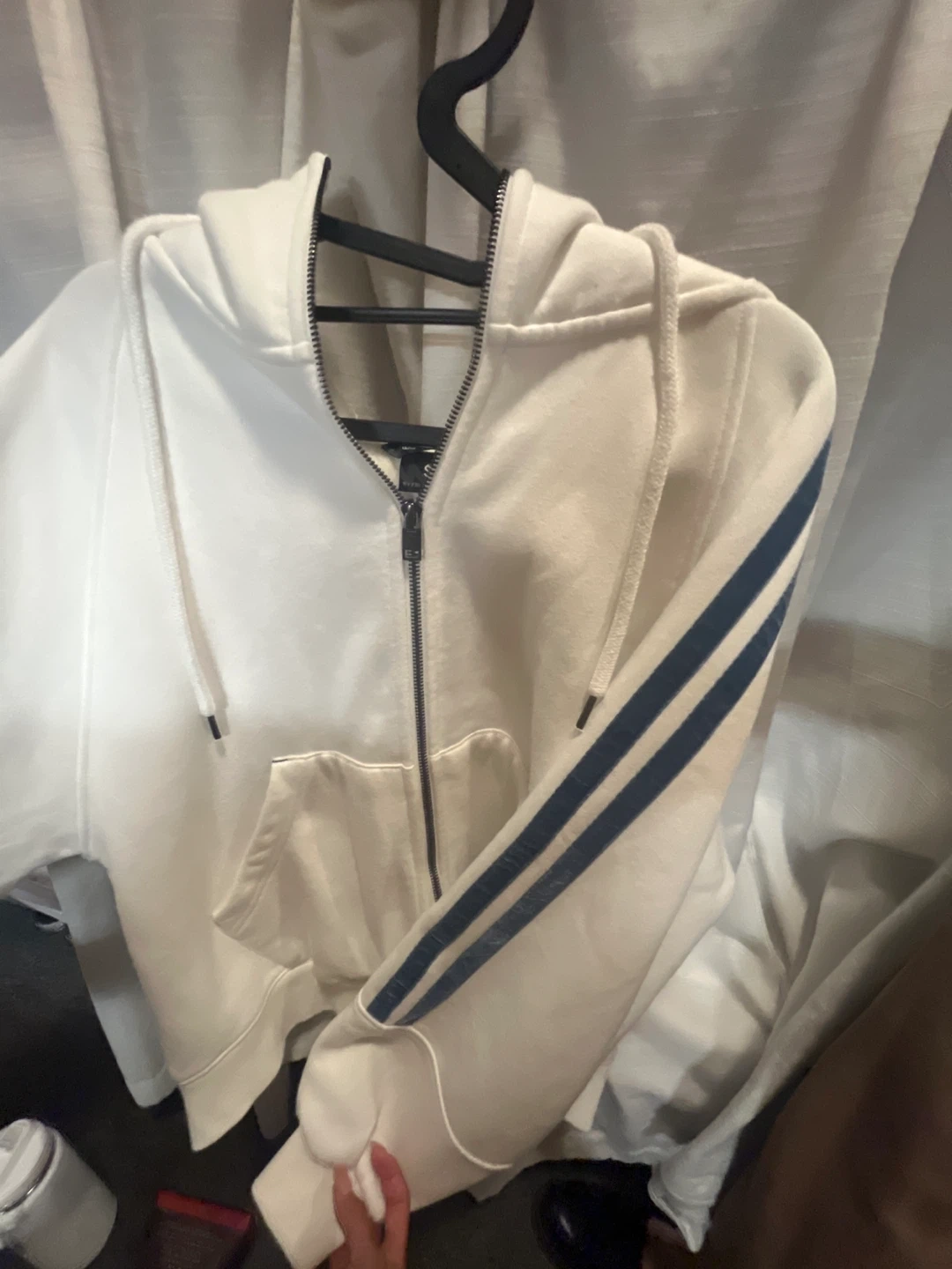 Selling a white zip-up hoodie with blue stripes on the sleeves! It's in great condition and ready for a new home. Perfect for layering or wearing on its own