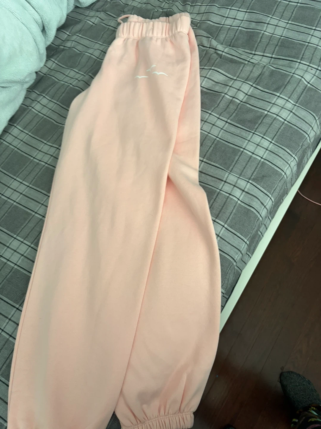 These pink sweatpants have an elastic waistband and cuffs. They feature a small graphic of three birds near the left hip. Made from a soft fabric, they're comfy for lounging or casual wear.