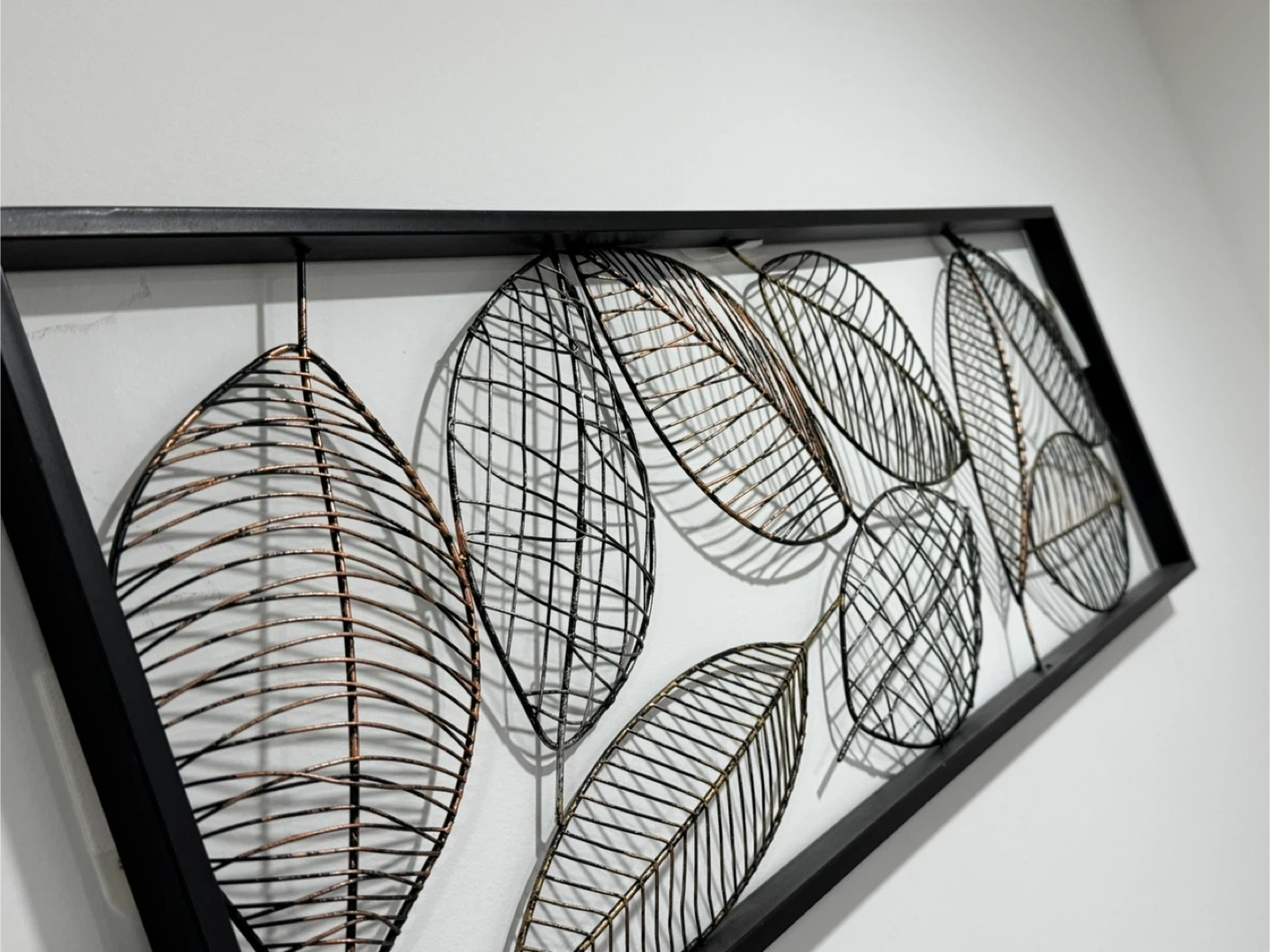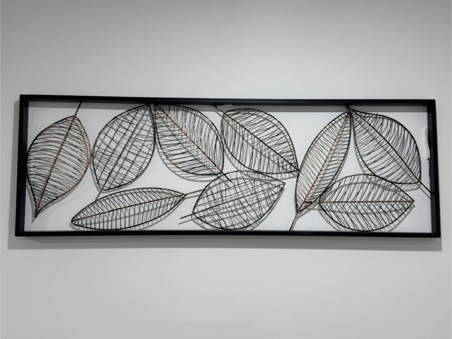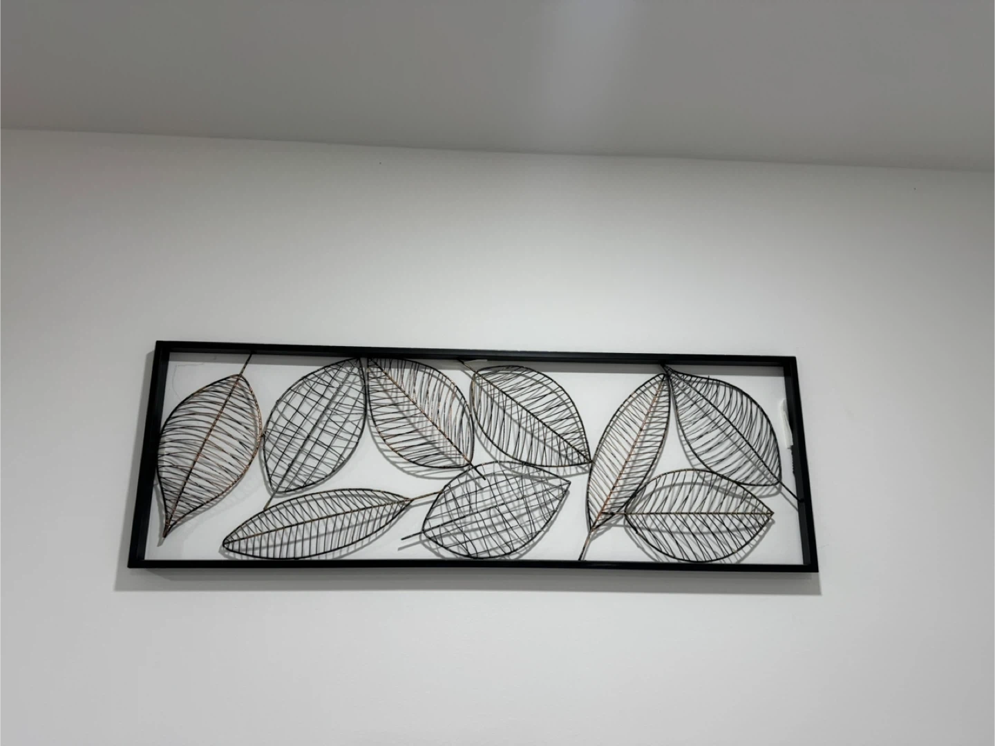Add a touch of nature to your home with this stylish metal leaf wall art! It features a black frame and intricate leaf designs. It’s in great condition and ready to hang in your living room, bedroom, or entryway