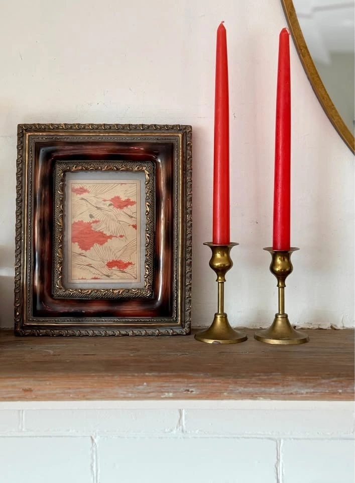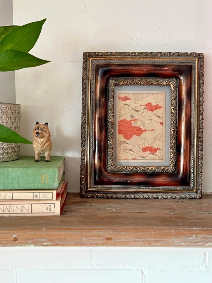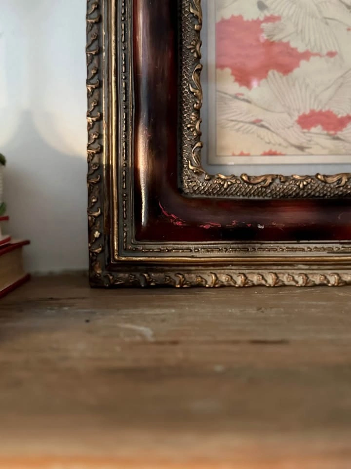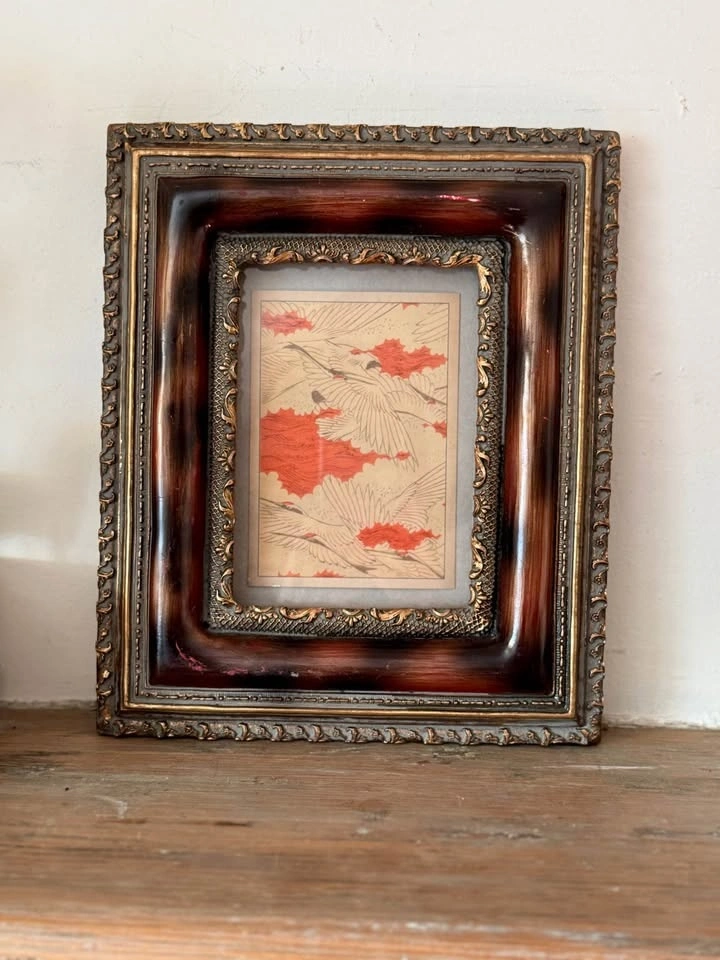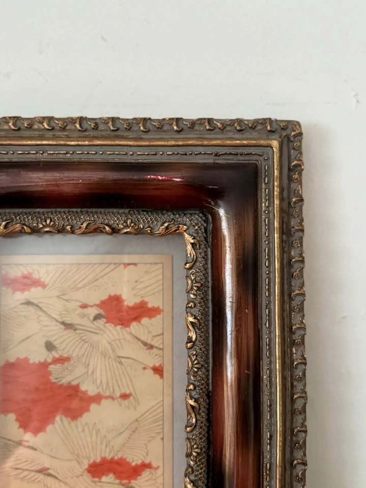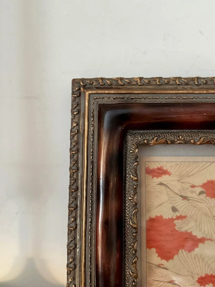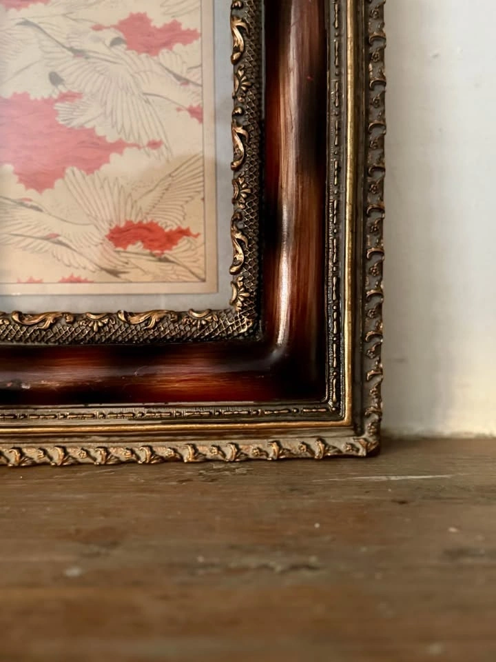 Frame featuring a rich faux burl-wood finish and gold molding. Includes a Japanese Crane print, but the backing is designed so you can easily swap out the art for your own photo or mirror.