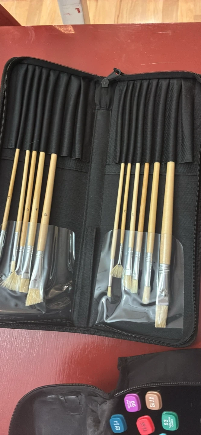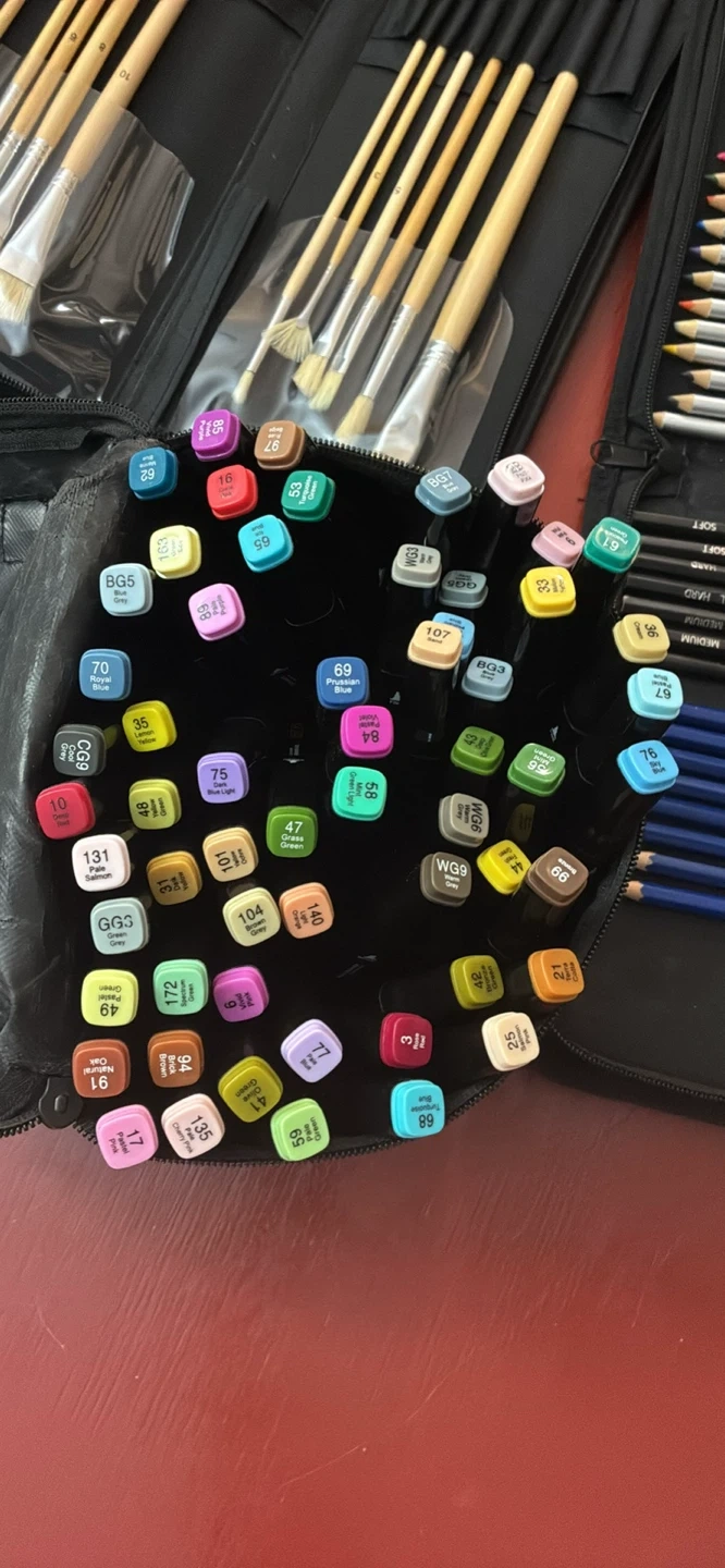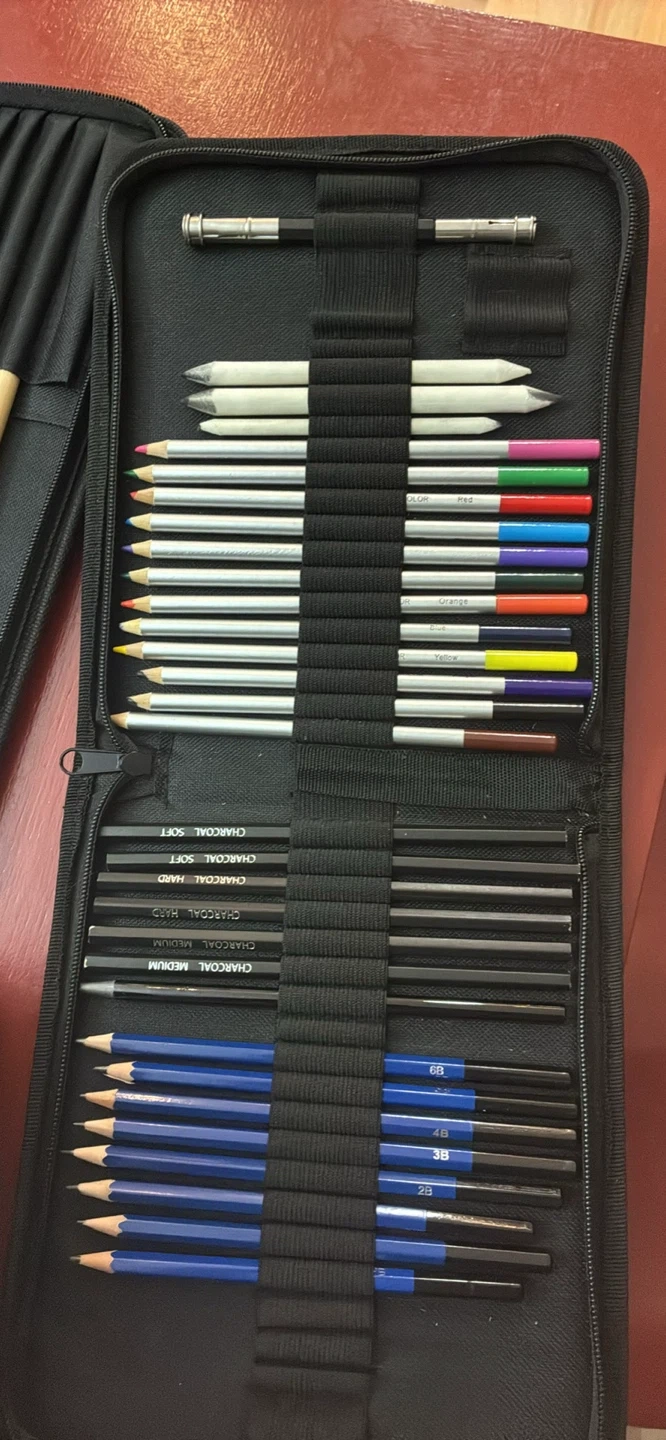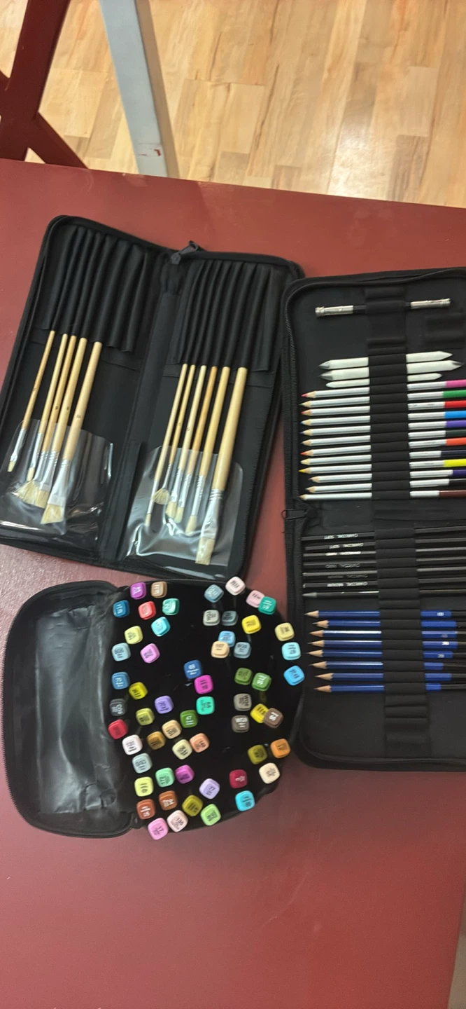 This comprehensive art set includes a variety of sketching pencils, charcoal pencils, coloured pencils, paint brushes, and markers. It's all organized in a zippered case for easy storage and transport. A sharpener and blending stumps are also included. Great for artists of all levels!