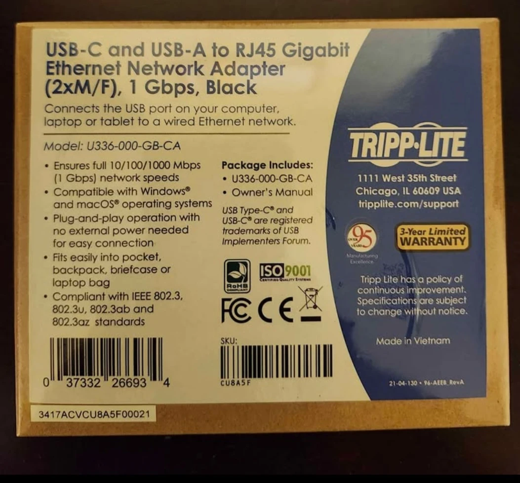 This is a Tripp Lite USB-C and USB-A to RJ45 Gigabit Ethernet Network Adapter. It ensures full 10/100/1000 Mbps network speeds and is compatible with Windows and macOS. Plug-and-play operation means no external power is needed for easy connection. It fits easily into a pocket, backpack, briefcase, or laptop bag and complies with IEEE 802.3 standards.