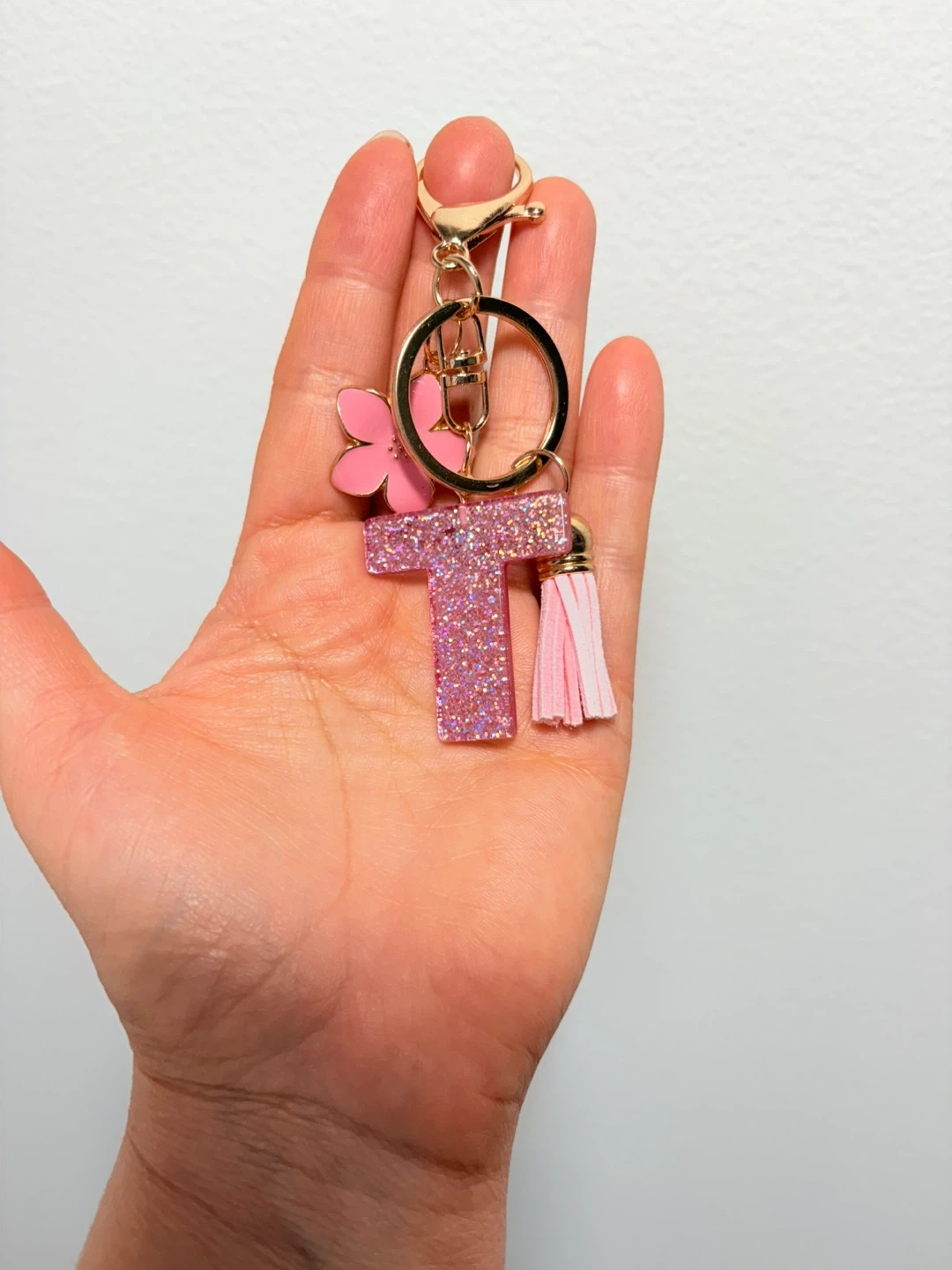 This keychain features a glittery letter 'T' charm with a pink flower accent and a light pink tassel. It's attached to a gold-tone keyring with a clasp. It comes packaged in a clear plastic bag.