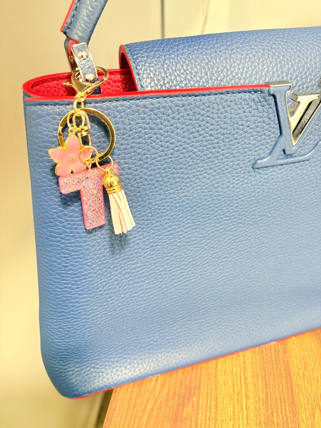 Glitter Letter T Keychain with Pink Flower and Tassel