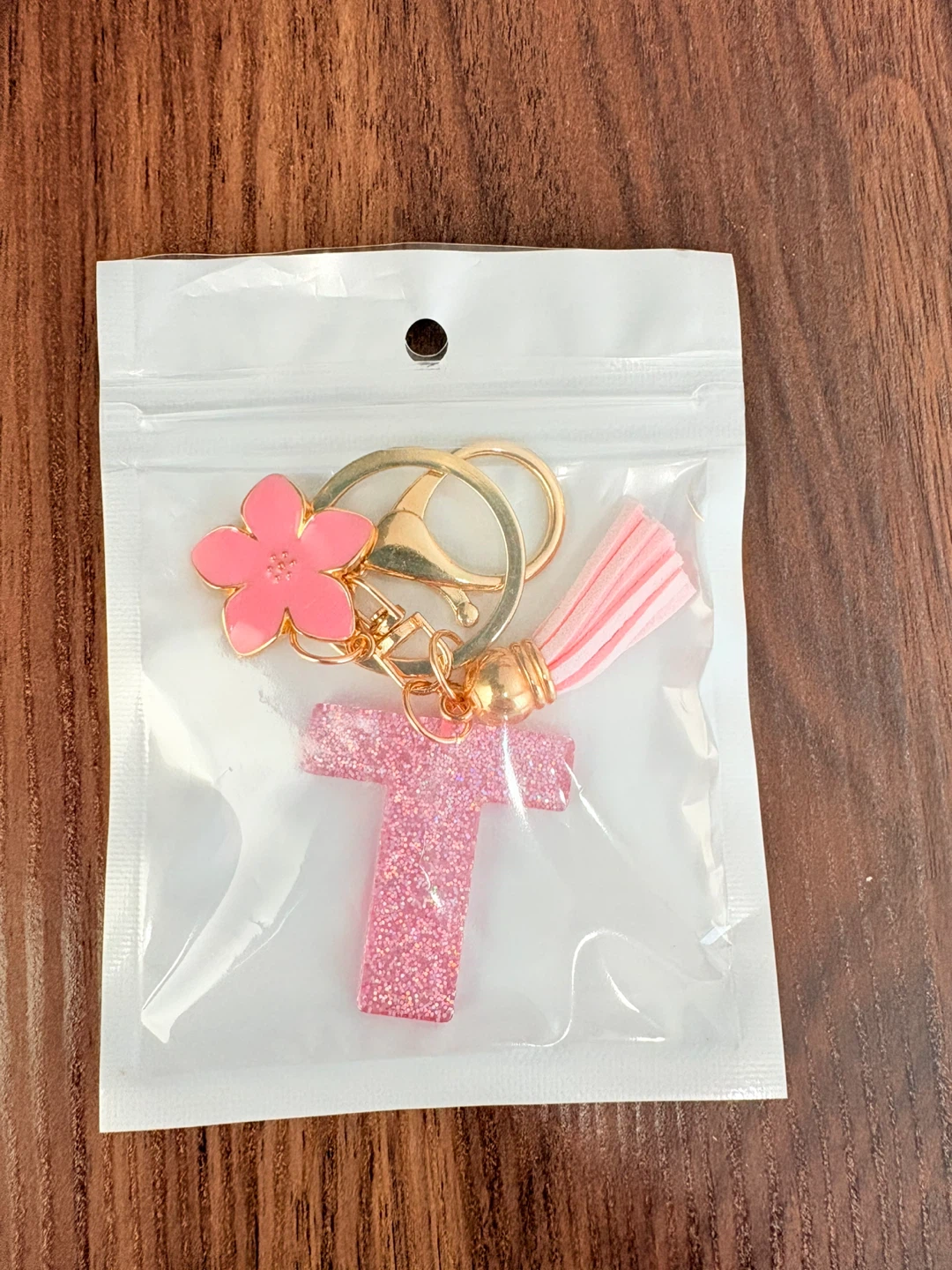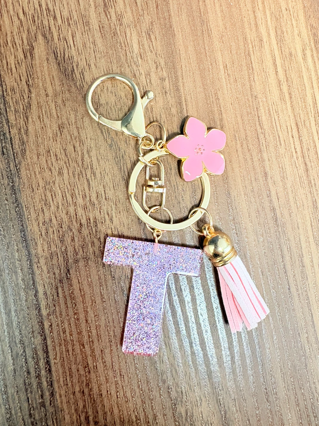 This keychain features a glittery letter 'T' charm with a pink flower accent and a light pink tassel. It's attached to a gold-tone keyring with a clasp. It comes packaged in a clear plastic bag.