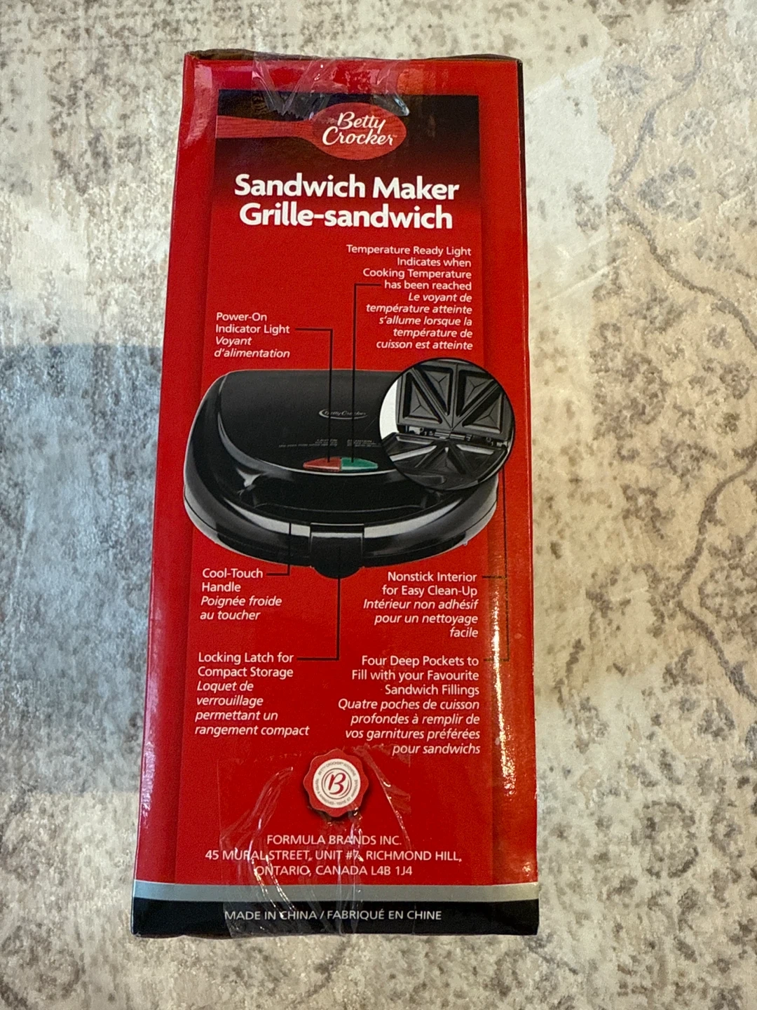 Selling a Betty Crocker Sandwich Maker in excellent condition! This handy appliance prepares two hot sandwiches at once. It features a temperature-ready indicator light and a power-on indicator light. The nonstick interior ensures easy cleanup, and it stands on end for compact storage. Four deep pockets let you fill with your favourite sandwich fillings. Get ready for delicious grilled cheese and other tasty treats! It’s in original box and used it only once…
