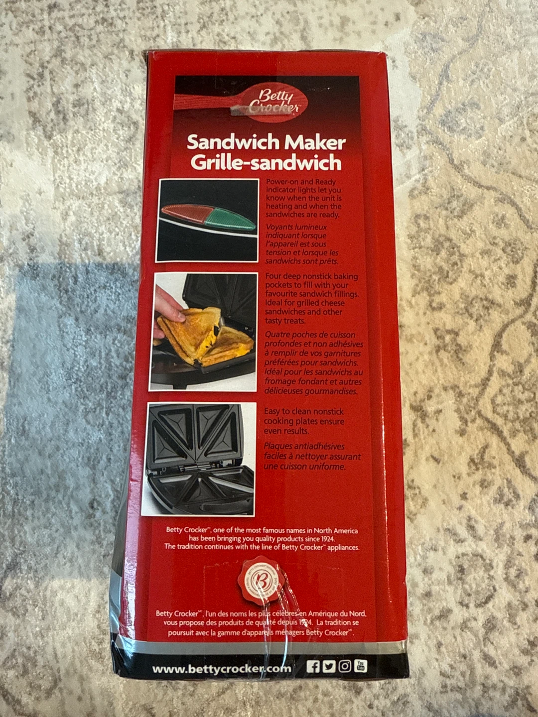 Selling a Betty Crocker Sandwich Maker in excellent condition! This handy appliance prepares two hot sandwiches at once. It features a temperature-ready indicator light and a power-on indicator light. The nonstick interior ensures easy cleanup, and it stands on end for compact storage. Four deep pockets let you fill with your favourite sandwich fillings. Get ready for delicious grilled cheese and other tasty treats! It’s in original box and used it only once…