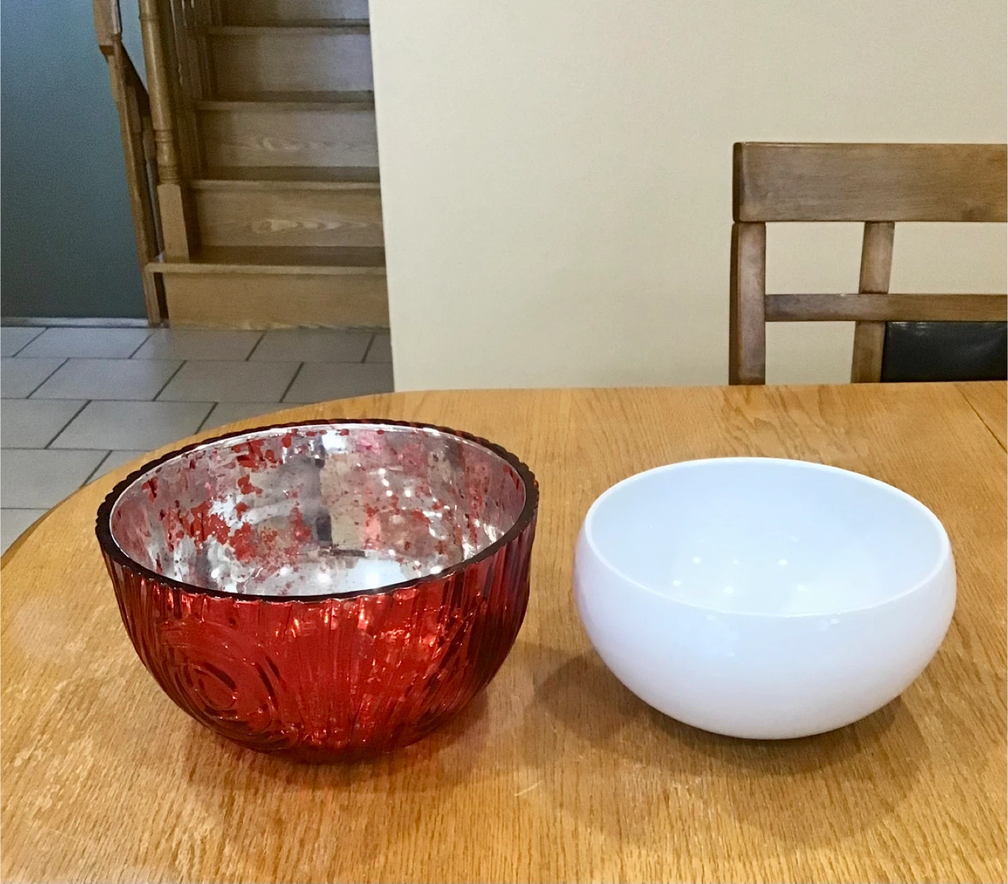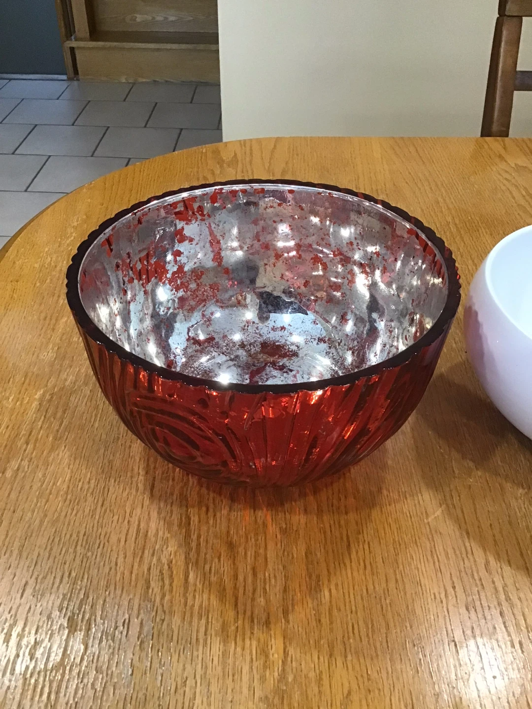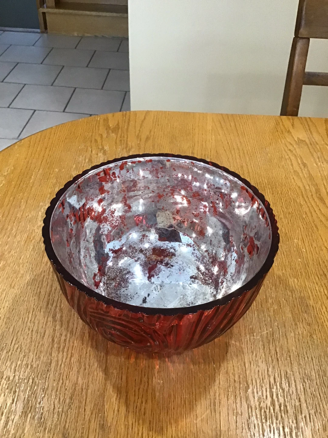 Decorative glass bowl in a vibrant red colour. Features a textured pattern and a slightly distressed interior finish.