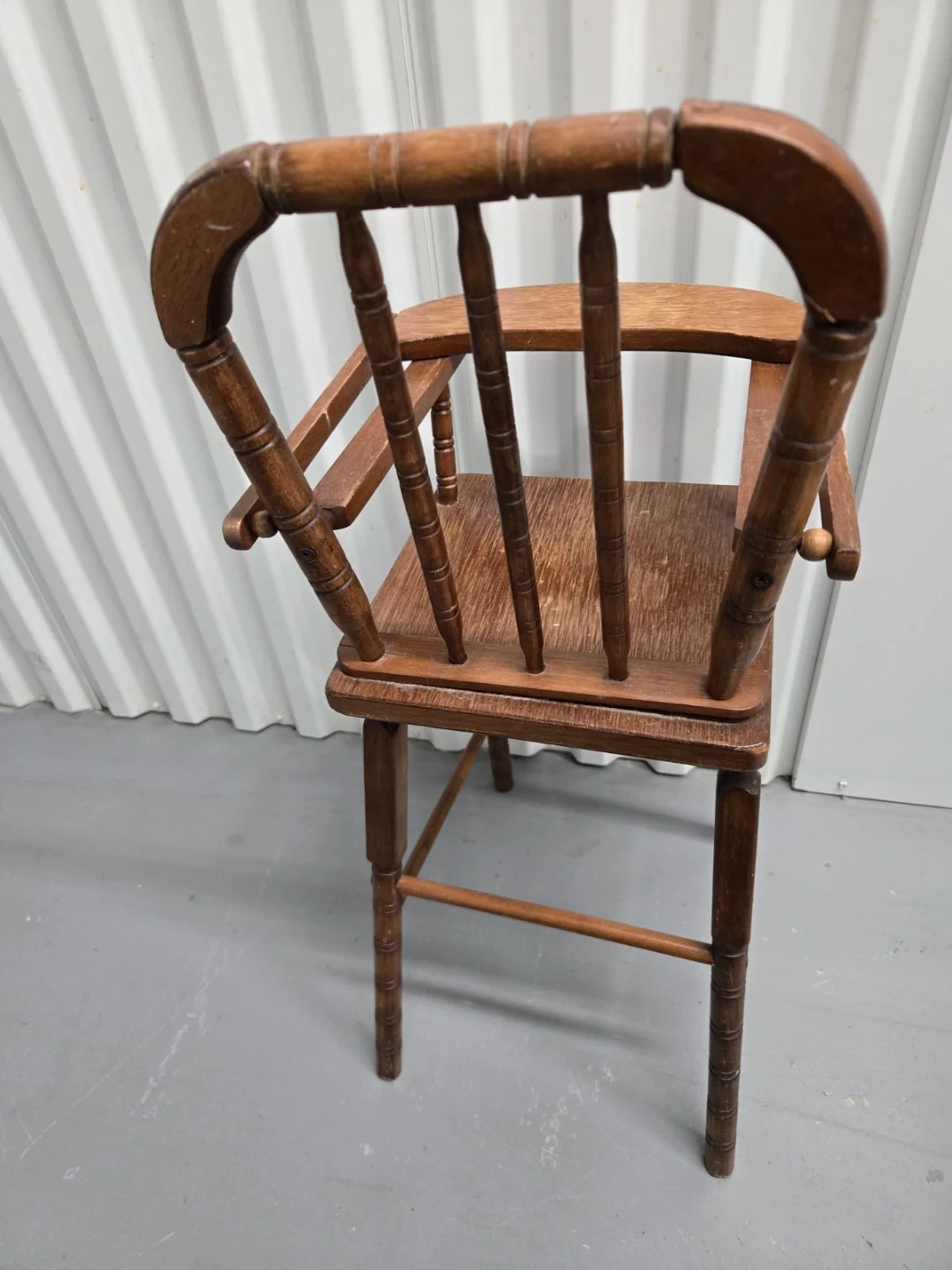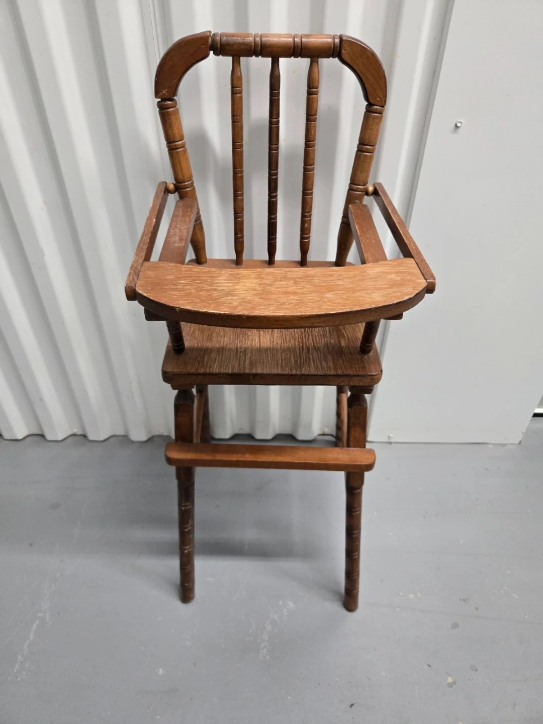 This is a vintage wooden high chair. It's made of solid wood with a classic design. The tray can be folded up for easier access. It's a sturdy piece that would be great for feeding a baby or toddler.