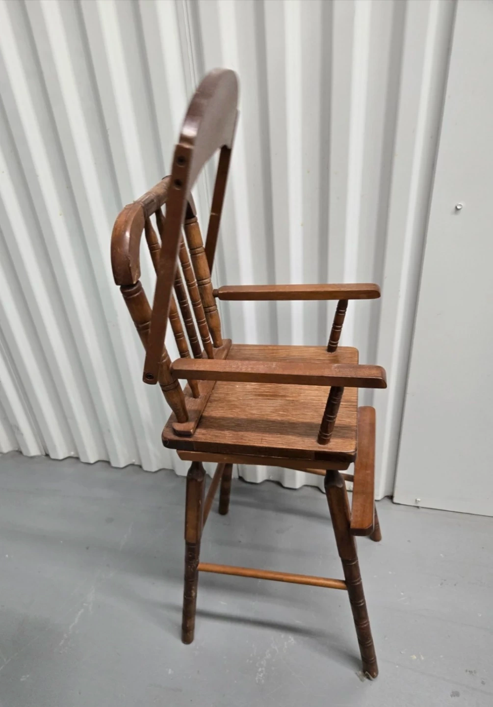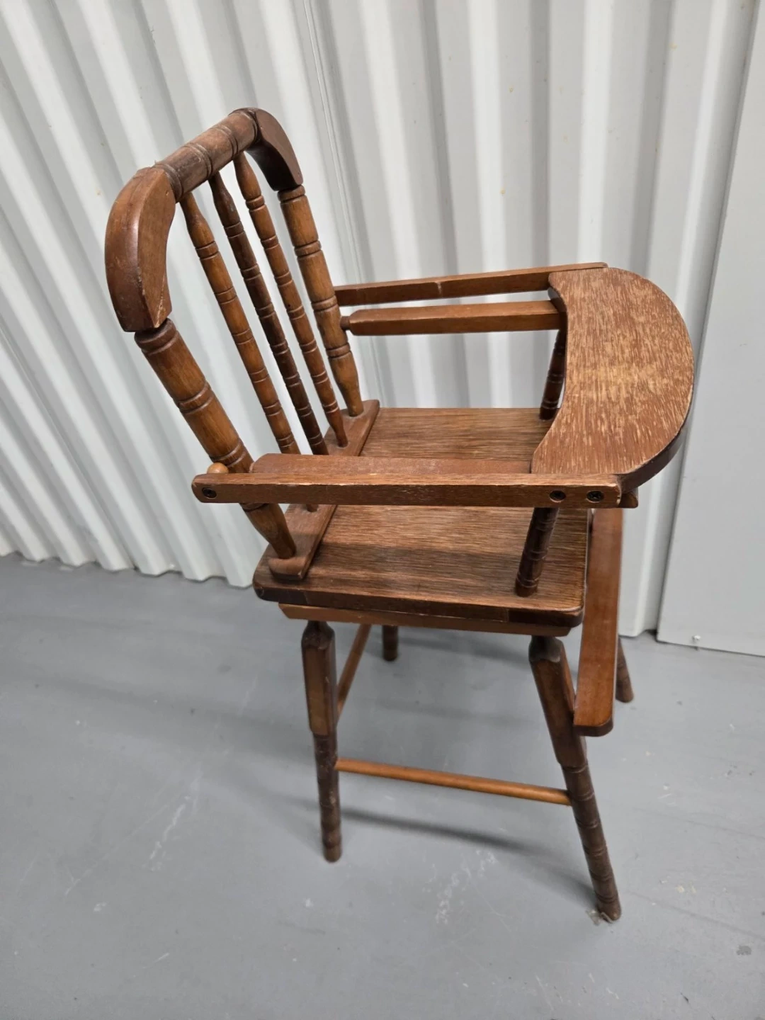 This is a vintage wooden high chair. It's made of solid wood with a classic design. The tray can be folded up for easier access. It's a sturdy piece that would be great for feeding a baby or toddler.