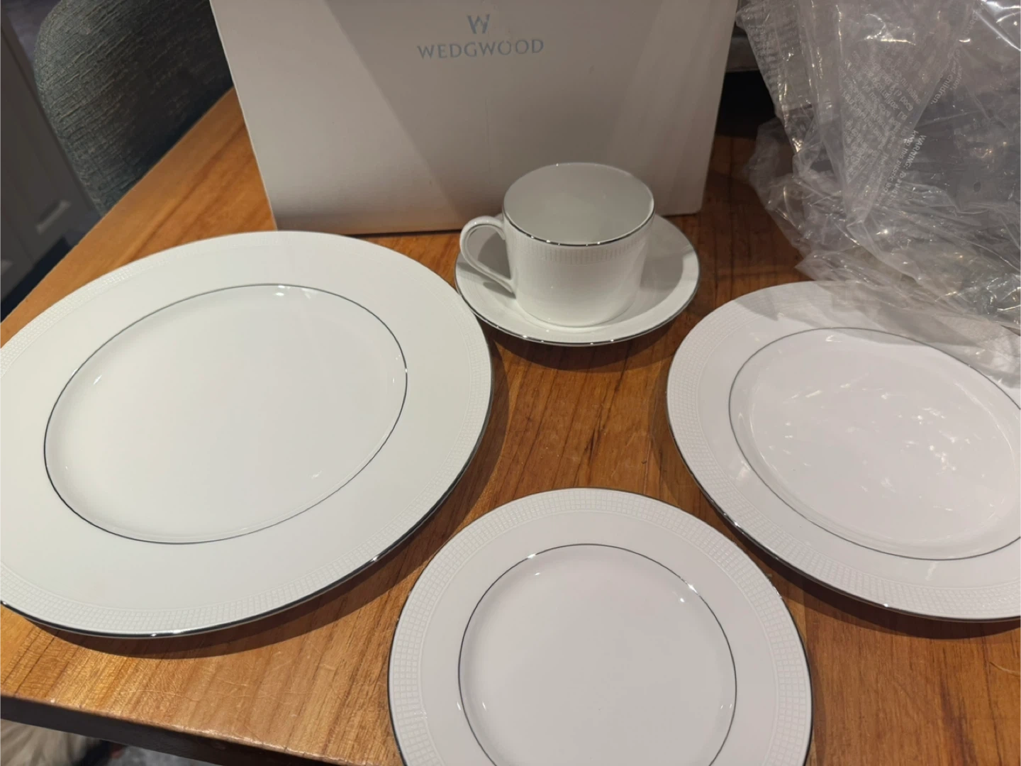 Selling my brand new Vera Wang wedgewood blanc sur blanc set. each set come with 5 pieces. pleased use photo as reference. i have 8 sets and would like to sell it as a set. these retail for over $300 per set.