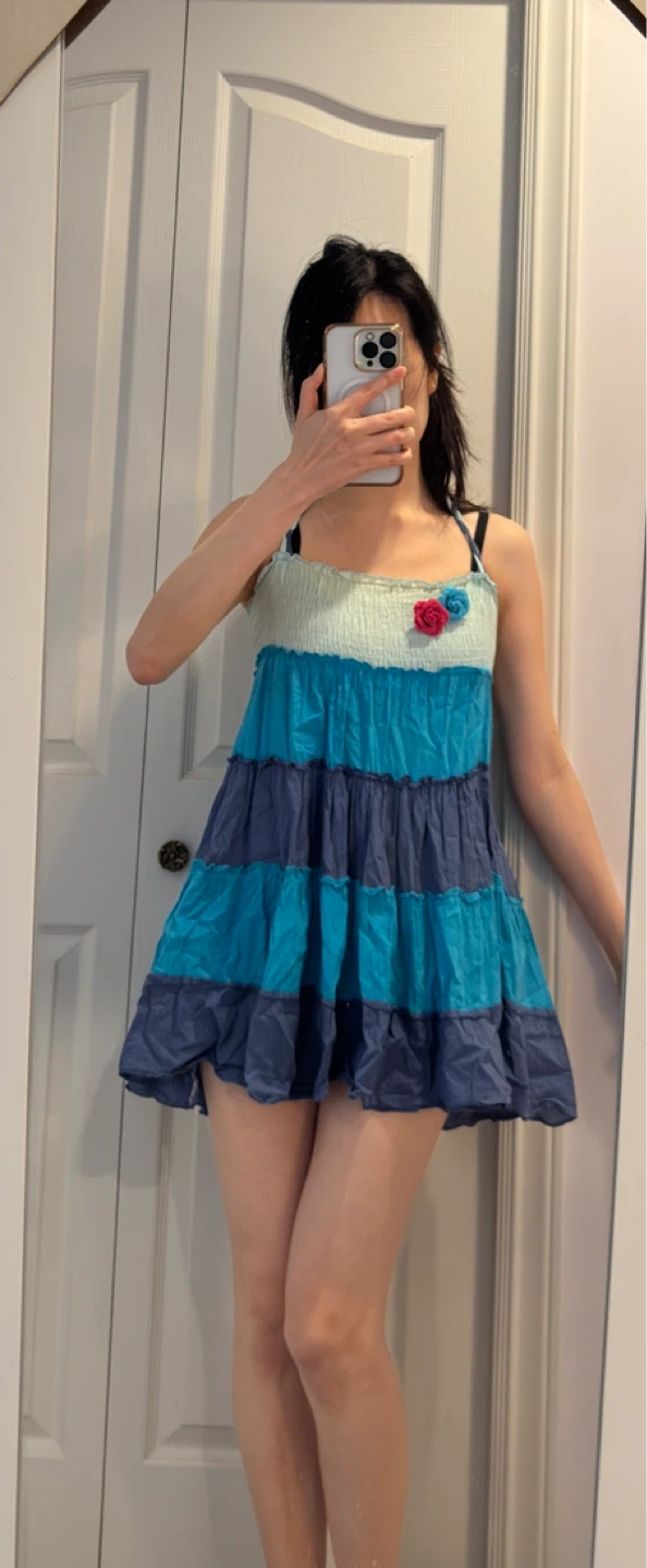A tiered boho-style halter dress in shades of blue and teal. It features a smocked bodice and decorative floral accents. This dress is perfect for warm weather outings!
