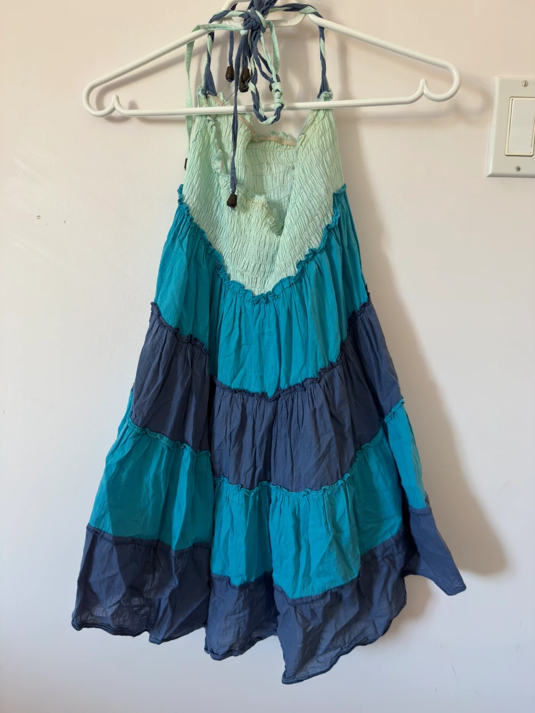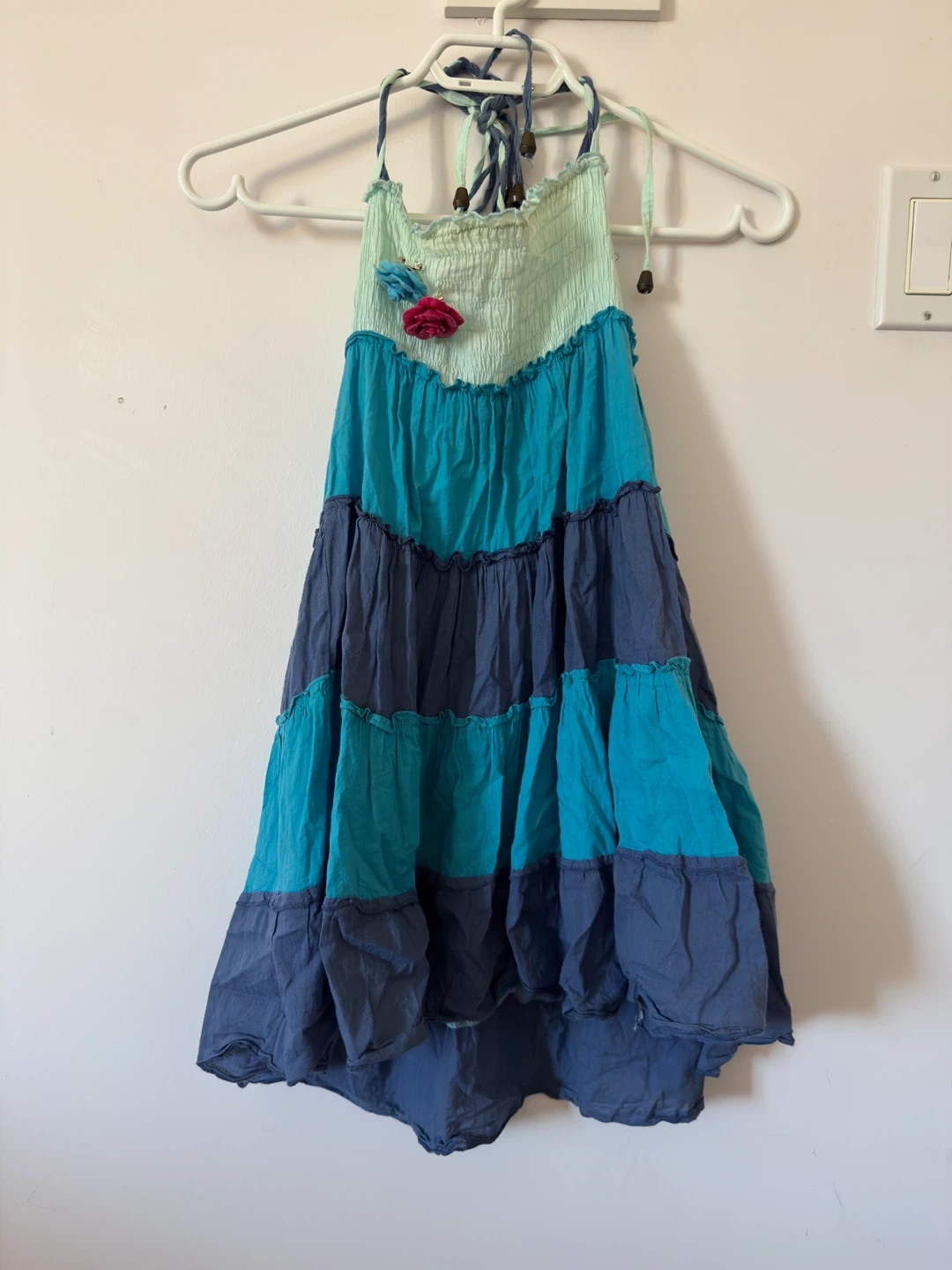 A tiered boho-style halter dress in shades of blue and teal. It features a smocked bodice and decorative floral accents. This dress is perfect for warm weather outings!