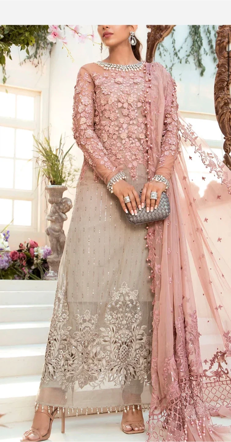 Beautiful pink and grey embroidered Pakistani dress. It features intricate floral and lace detailing with sequin embellishments. Comes with a matching sheer dupatta. This outfit's perfect for festive occasions.